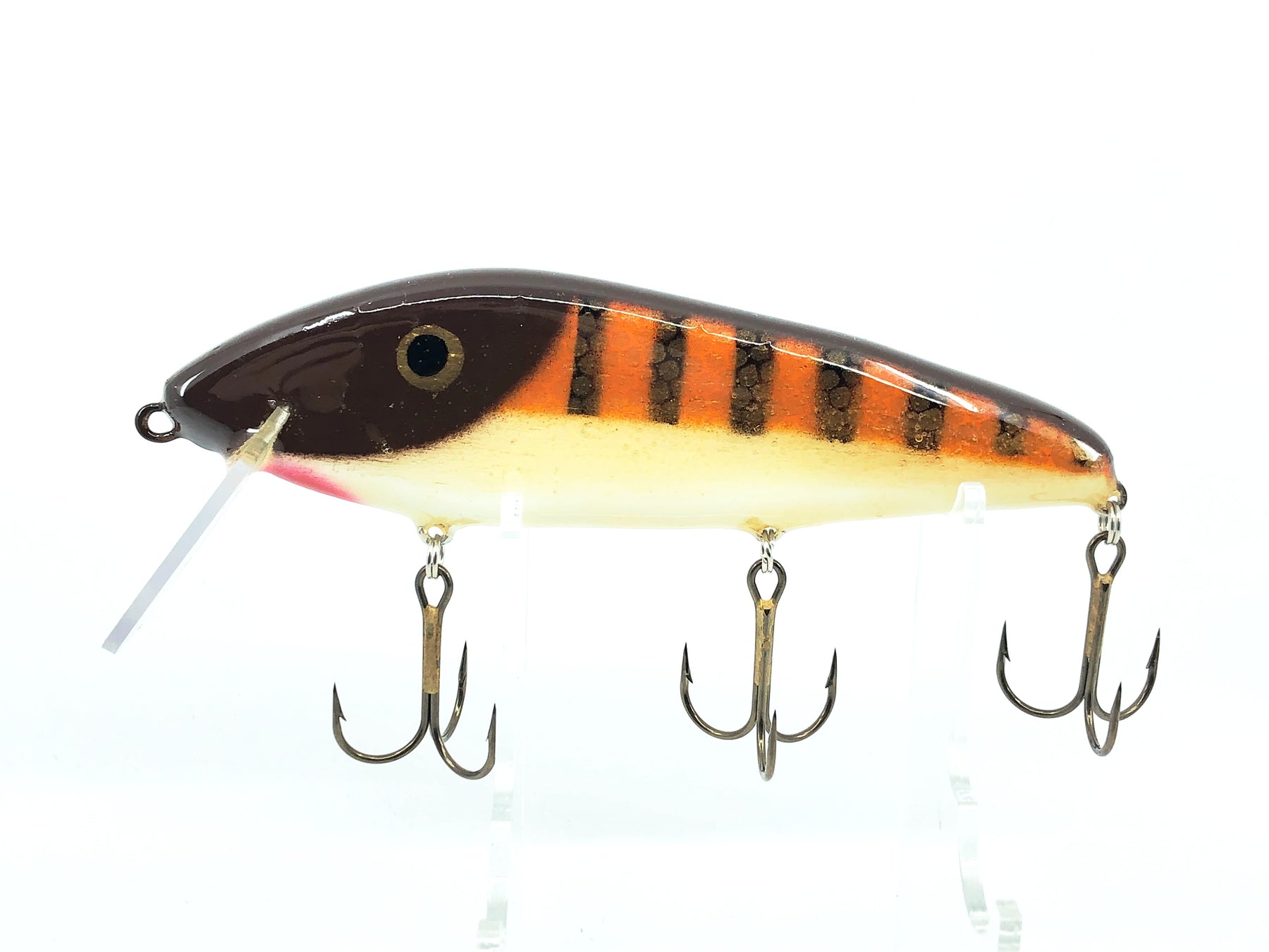 Crane 306 Musky Bait, Brown Perch/White Belly Color. Hard to find these classic Musky baits on card.  About 6" long excluding the lip. Bait is used with some minor wear but overall good condition. See photos.  Great classic bait here.