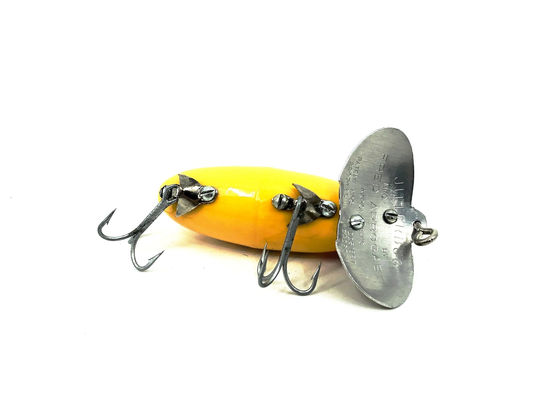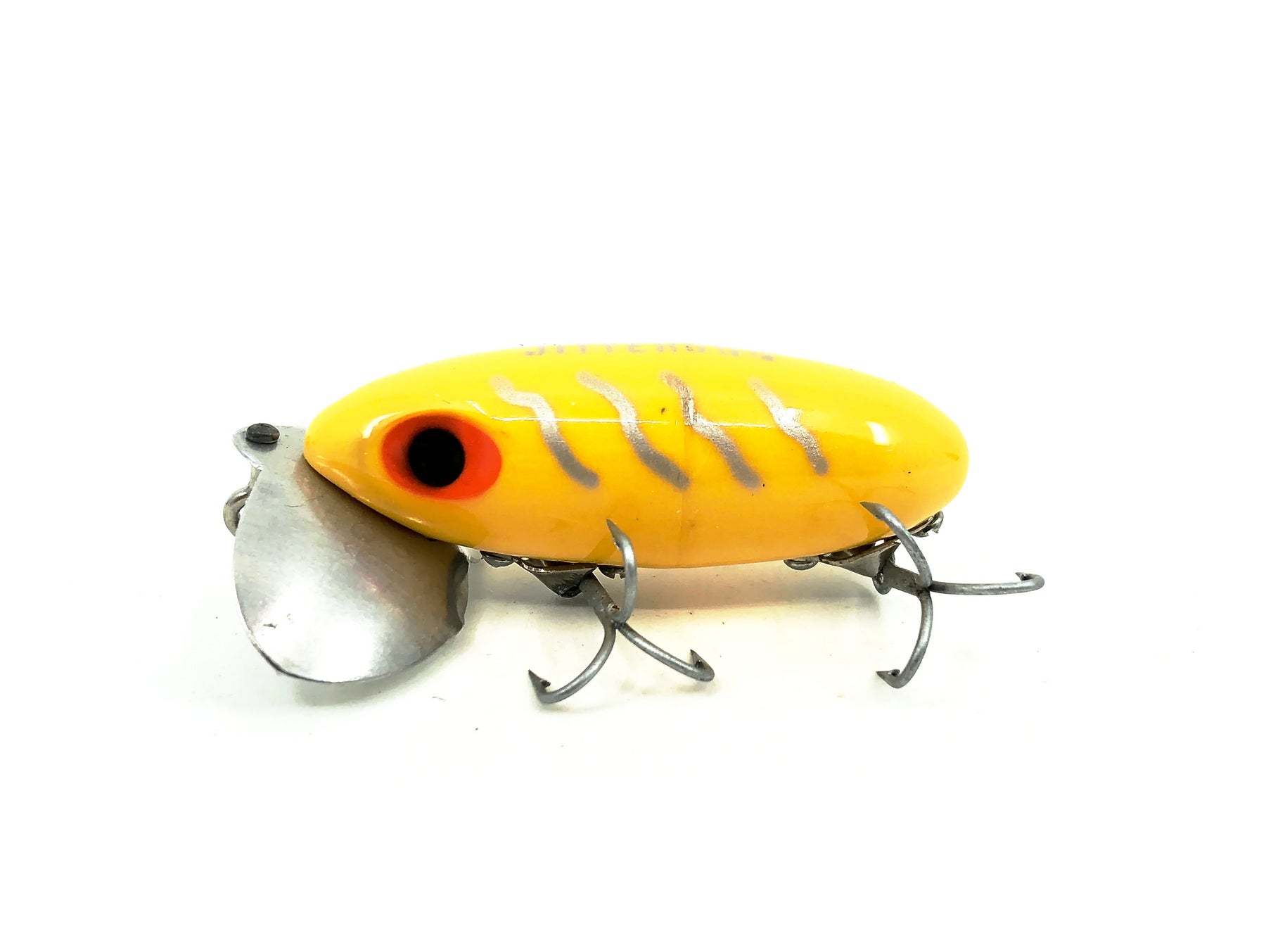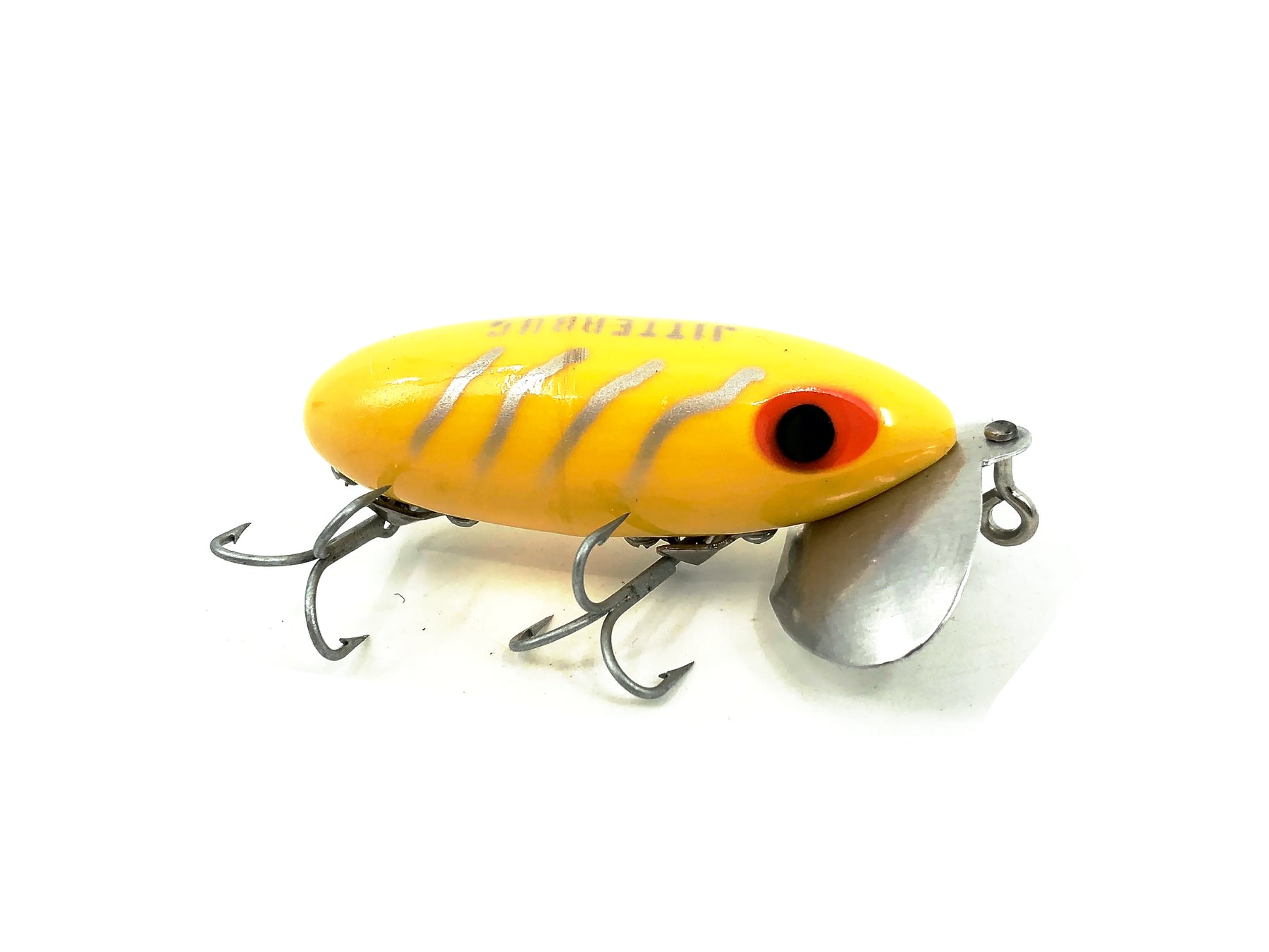 Arbogast Jitterbug 3/8oz, Yellow Shore Minnow Color. Newer pressed eye Jitterbug. Body is about 2 1/4" long. Used with only some minor wear but overall still in good condition. Fish or collect, see photos.