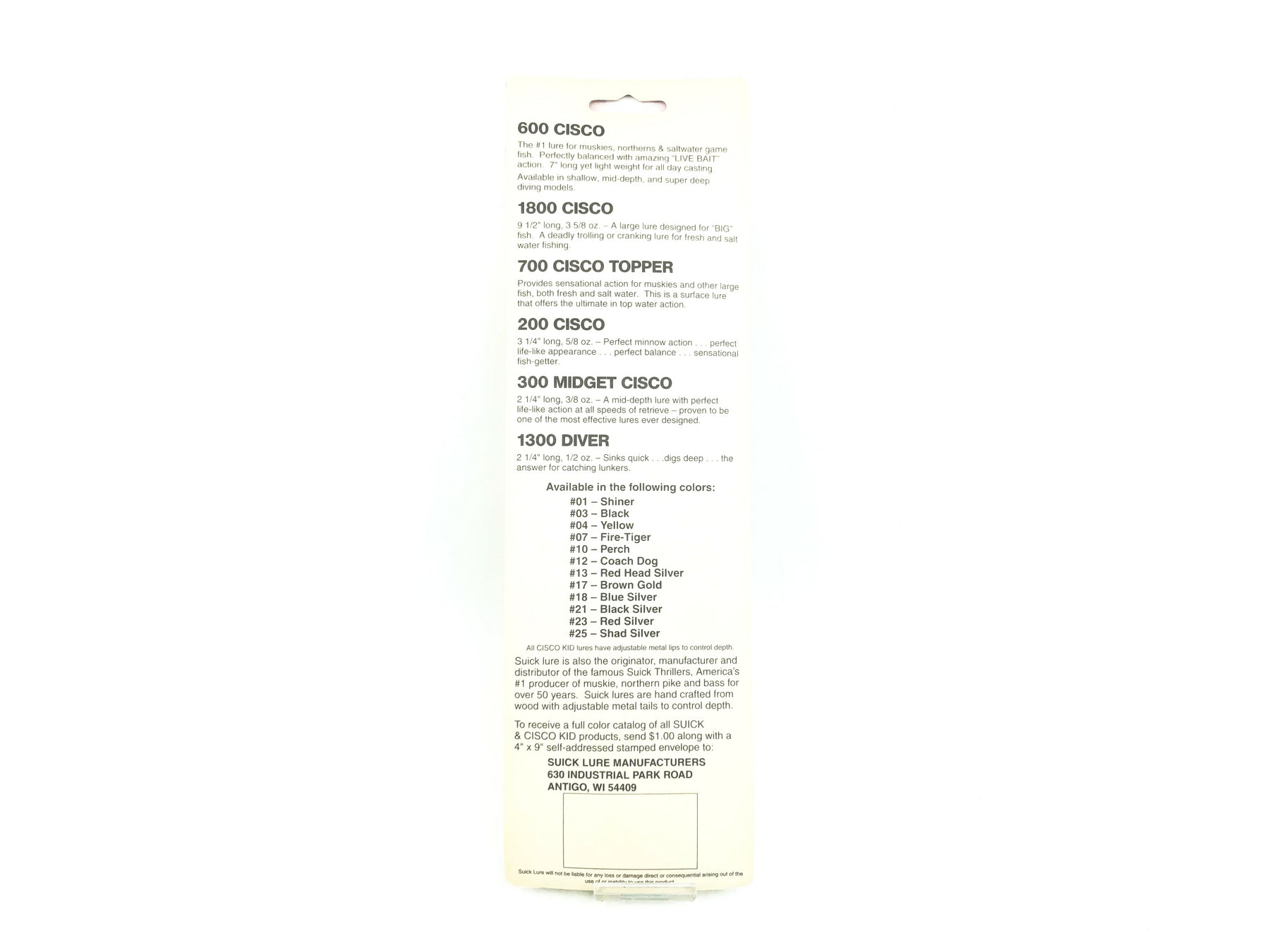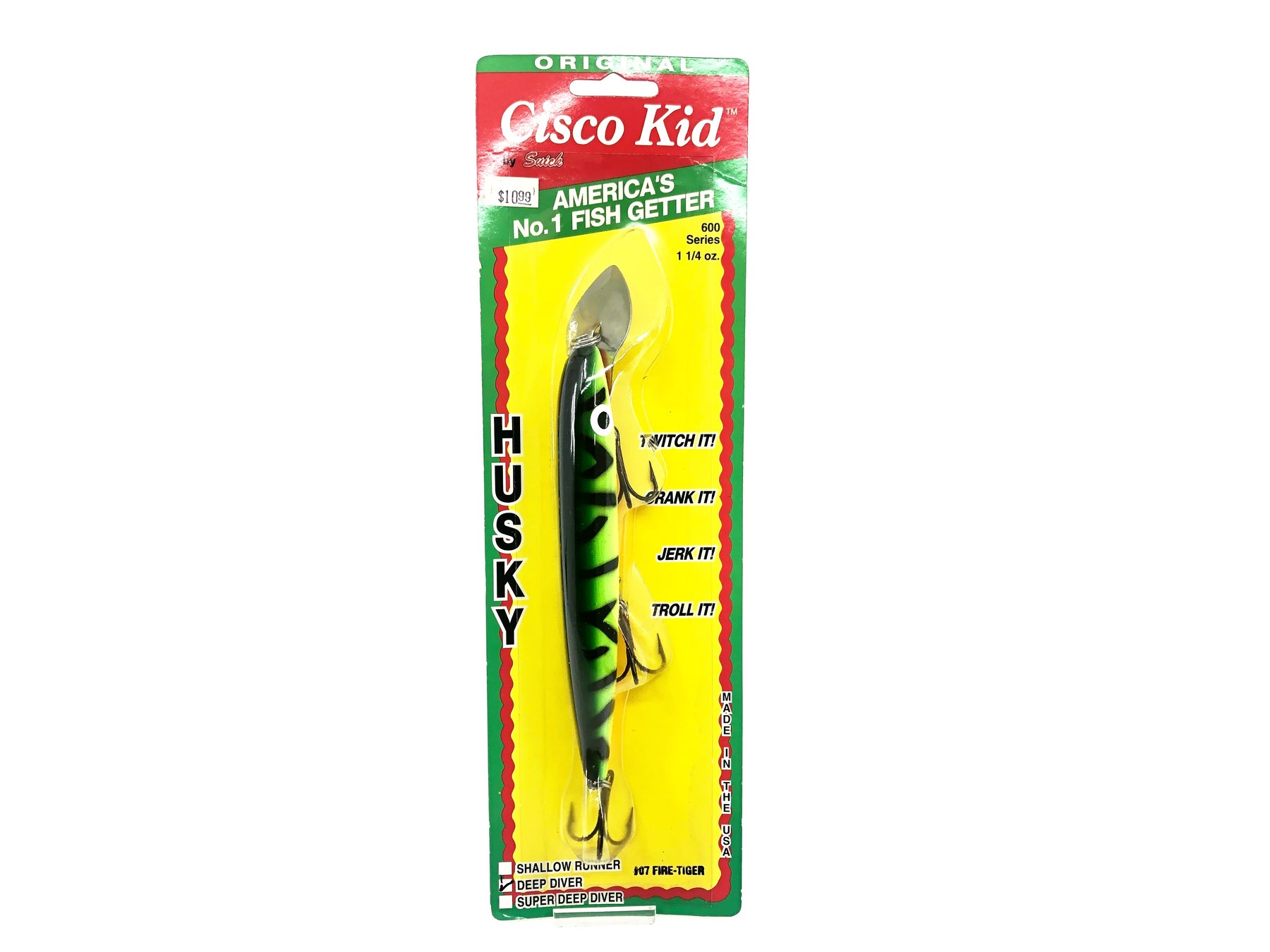 Cisco Kid 600 Series, #07 Fire Tiger Color on Card. About 7" long including lip. Great vintage Cisco Kid lure here. Great for fishing, walleye, bass, pike! Great for collecting. This is a newer vintage Cisco Kid but still hard to find! Lure is new on card and the card is in good condition. See photos. Fish or collect!