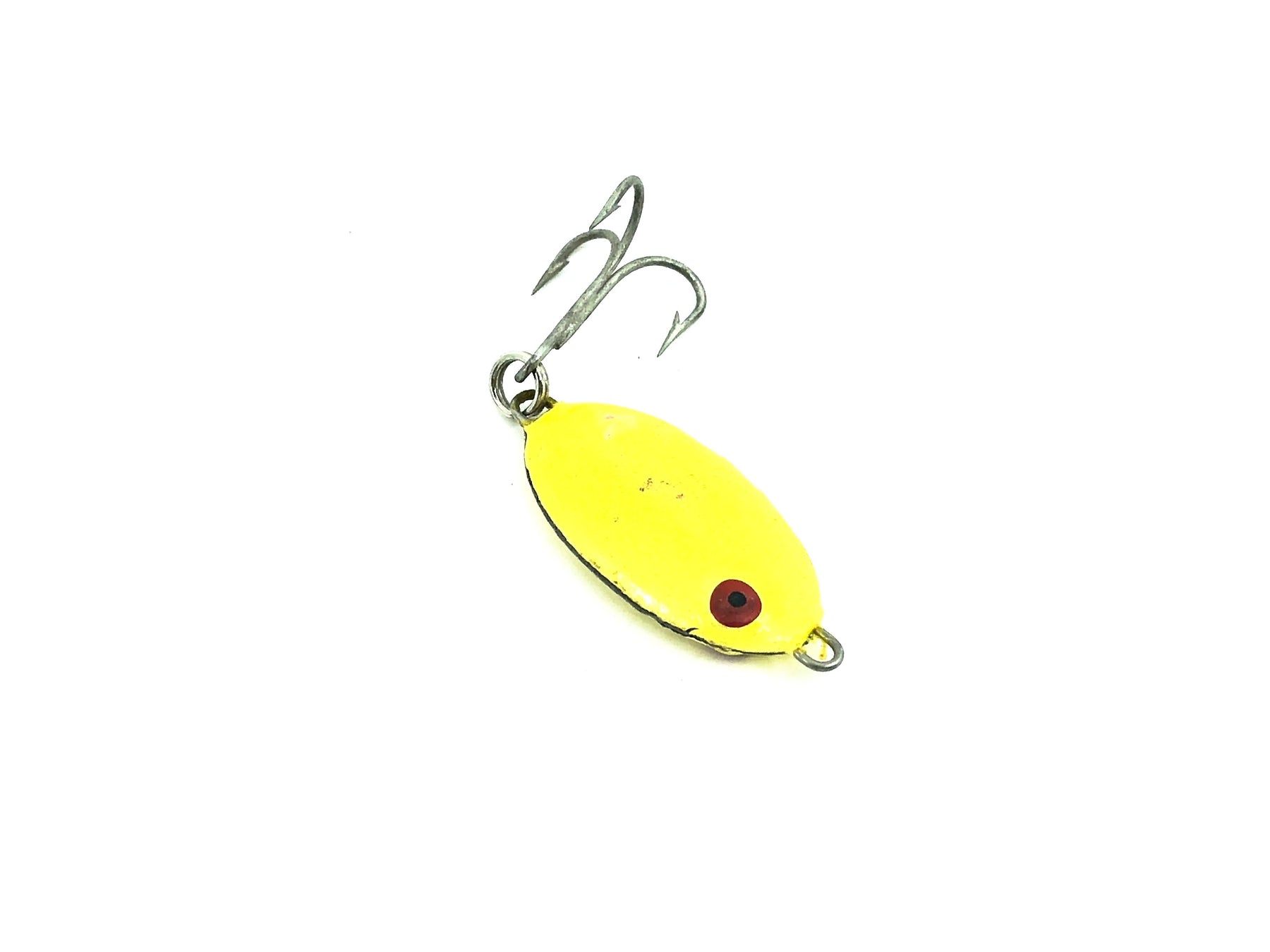 Bomber Slab Spoon 8860, Yellow Color. Lure body is about 1 3/4" long. This metal bait is used with some missing paint on one side and other wear still in overall fair condition. Fish or collect a classic bait. See photos.