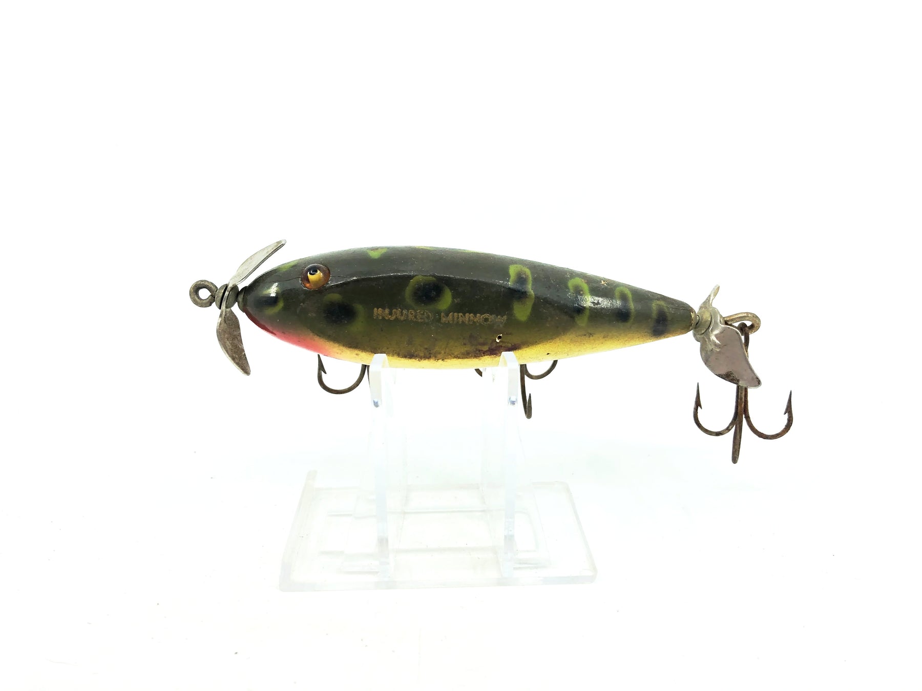 Creek Chub Wooden 1500 Injured Minnow, Frog Color 1519. About 3 3/4" long. Wooden lure, glass eyes. Used lure with some wear but overall good condition, see photos. One of the all time classic Creek Chub lures.