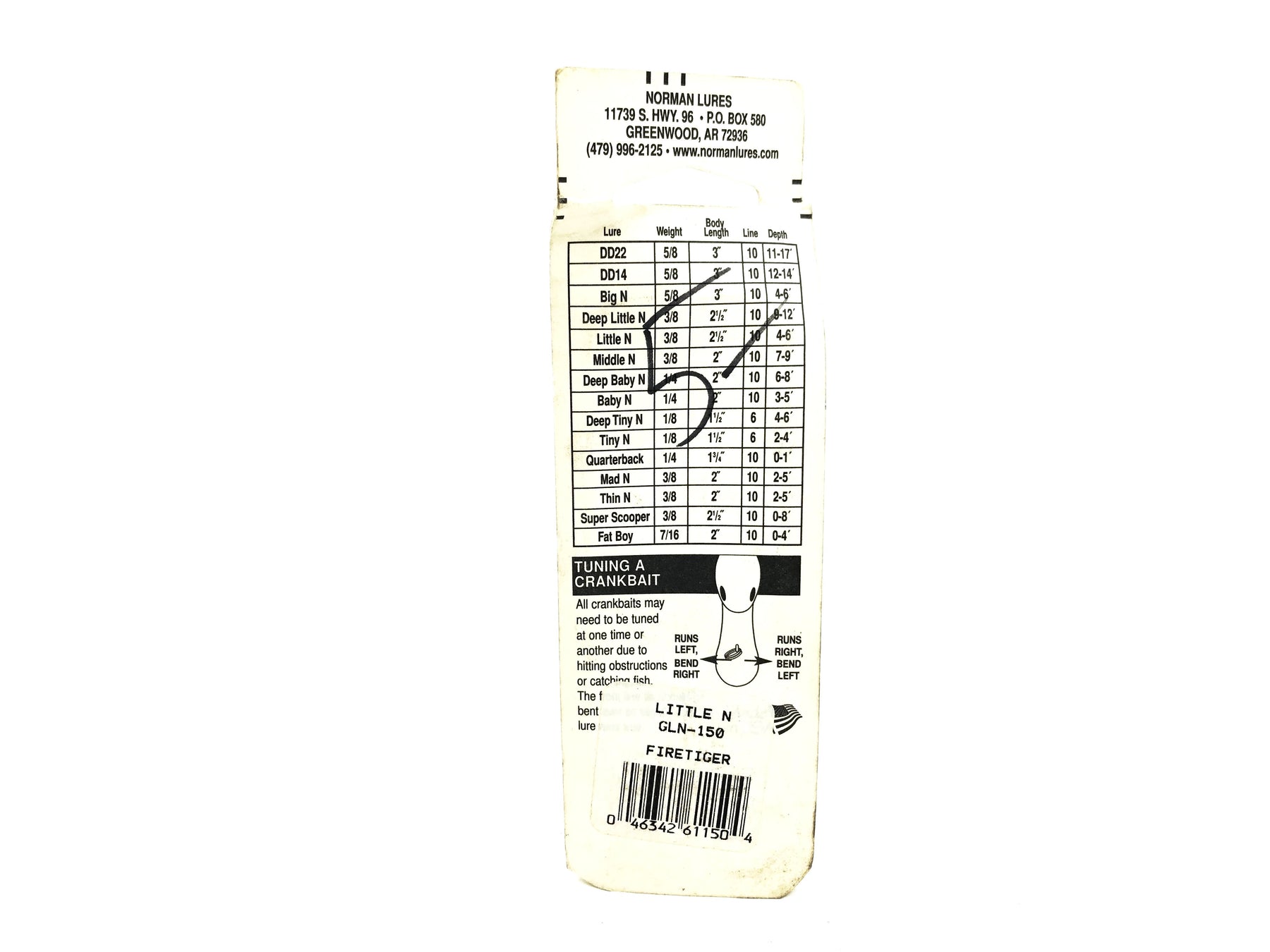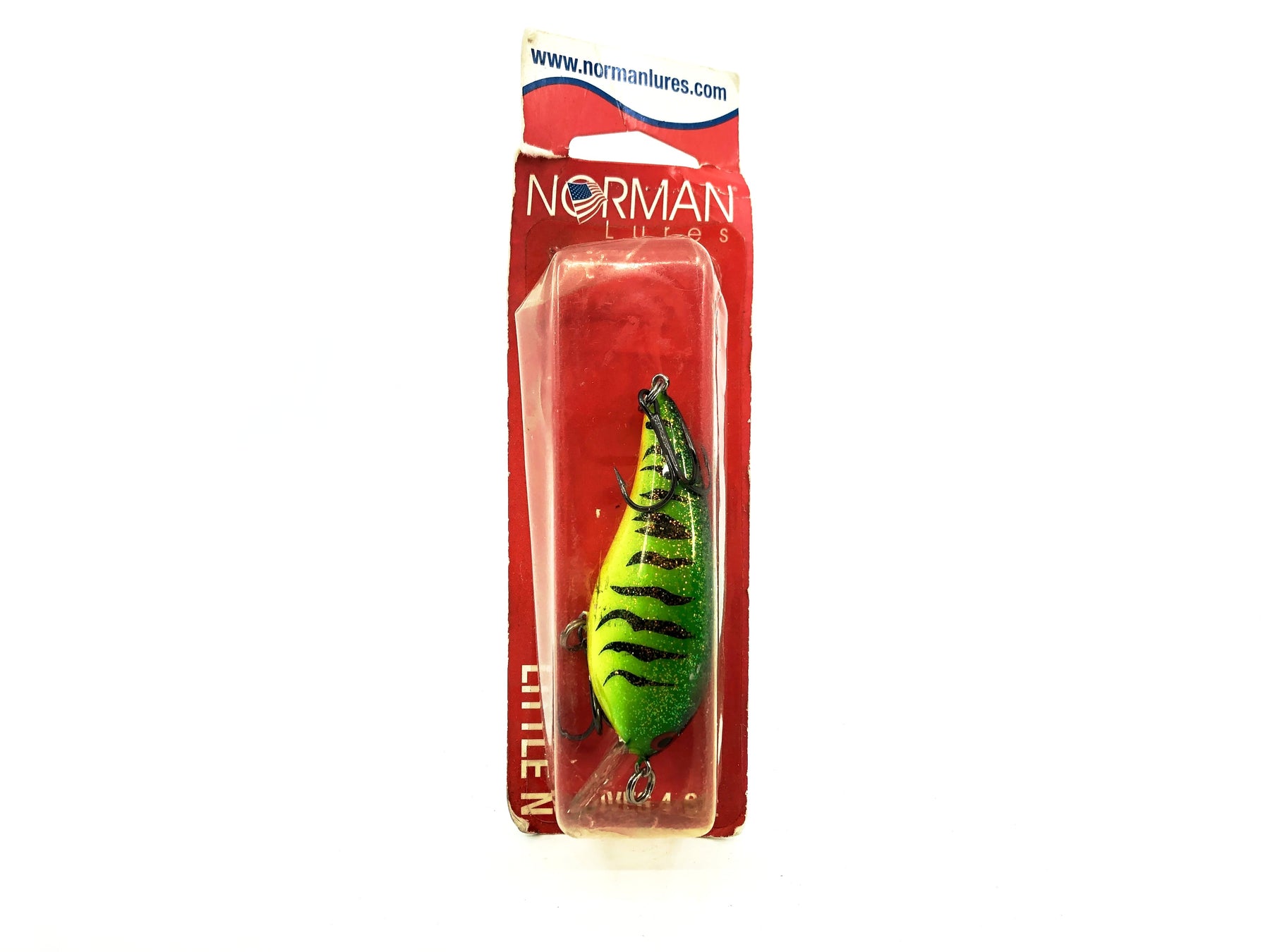 Bill Norman Little N GLN-141, Gel Coat Firetiger Color on Card. Great combo here. Card has some wear and damage to the bubble. Lure is new on card. Lure is about 3 1/8" long including lip. Fish or collect.