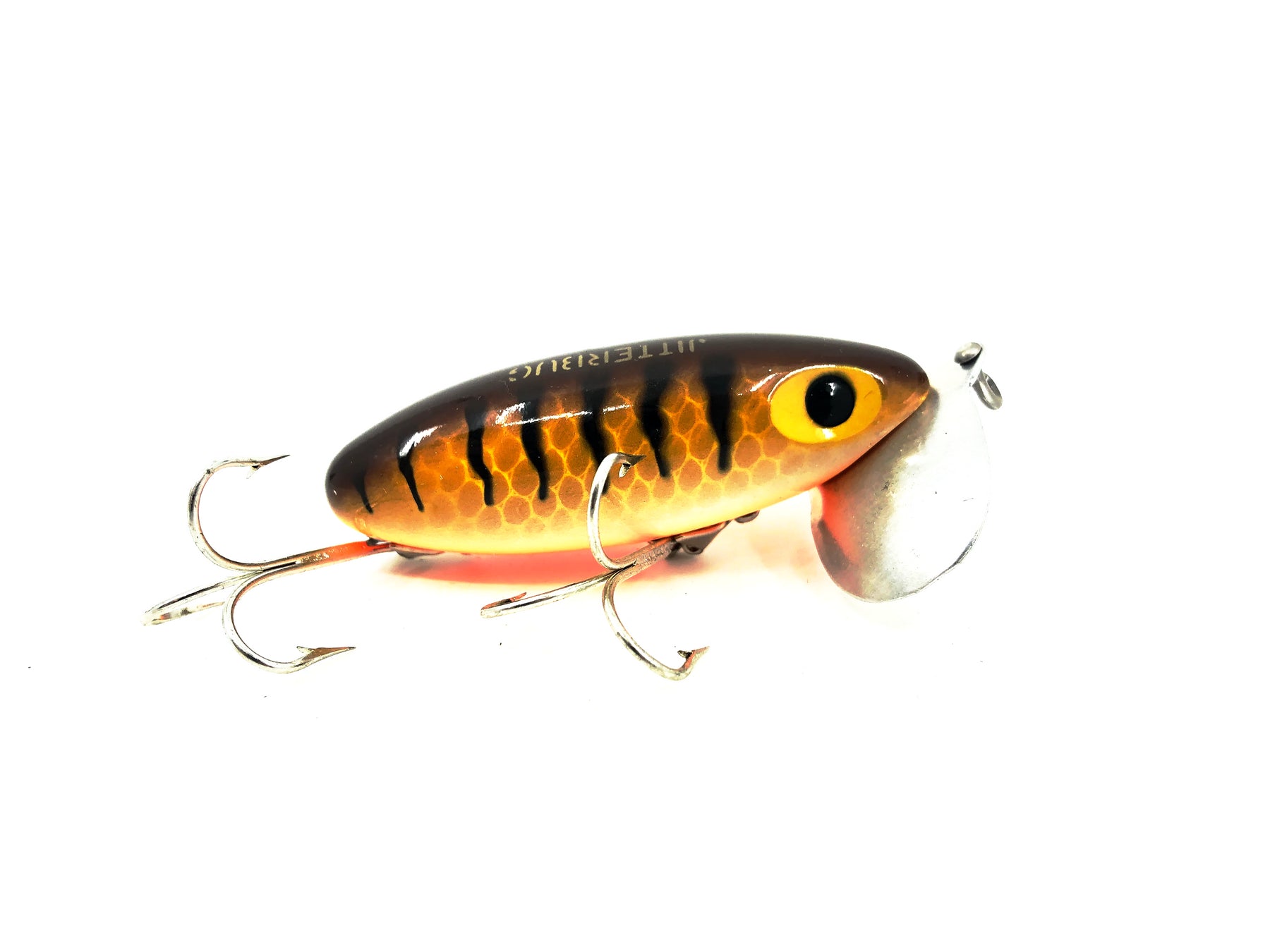 Jitterbug, World's best surface bait! Jitterbugs wobble. . . the double-lobed "lip" creates a loud paddling noise . . . takes bass day or night. Retrieve continuously or by hesitation.