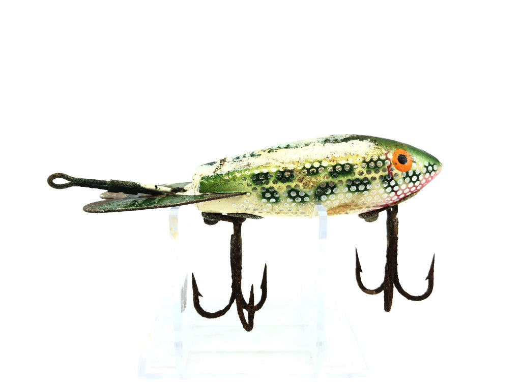 Bomber Wooden 600HD Color #83 Metascale Green Back Shad. About 4" long. Lure is used with rust, wear, and cracks in the paint. Fish this one. These heavy duty bombers are in high demand, get yours today!