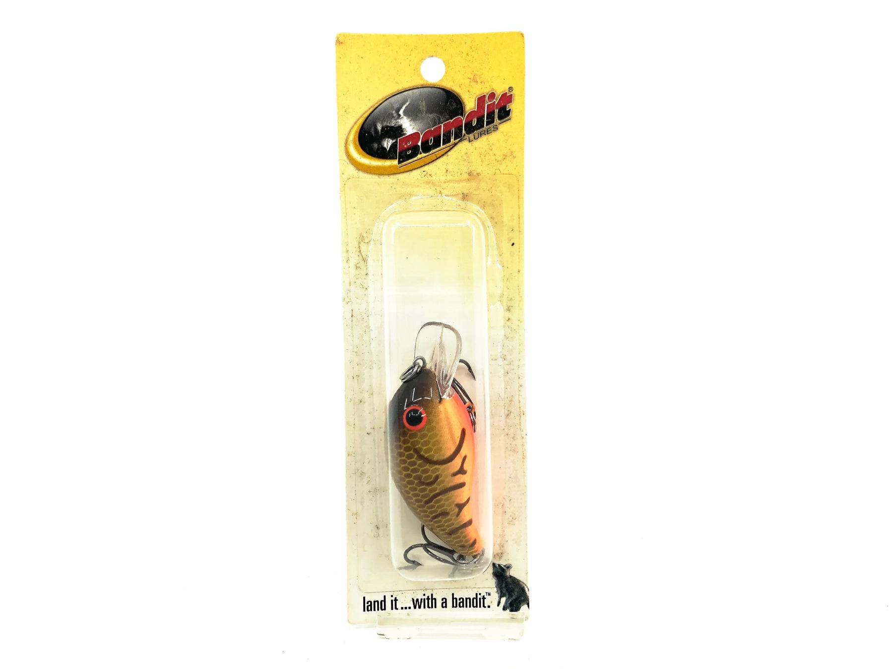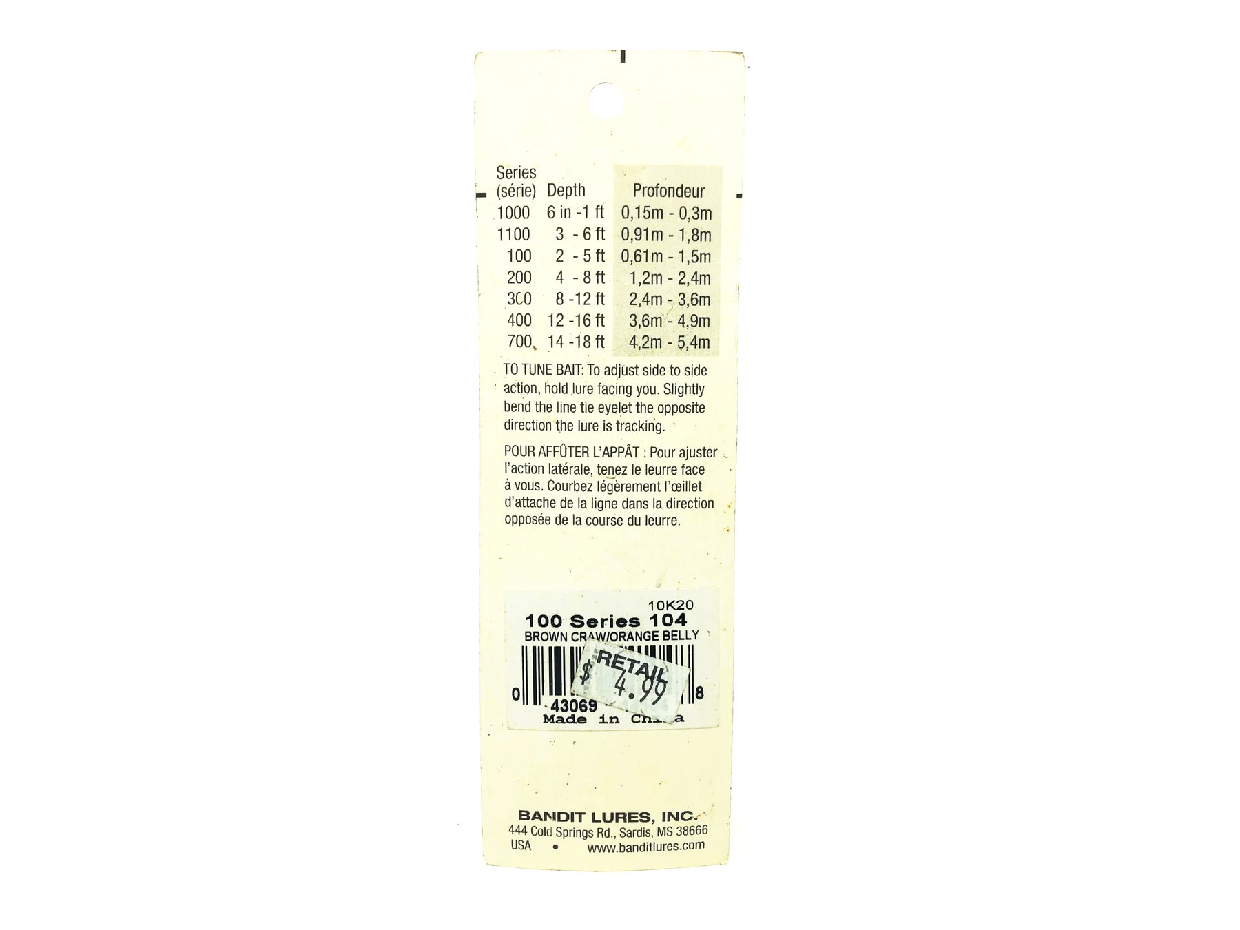 Bandit Series 100, 104 Brown Craw/Orange Belly Color. Old stock Bandit here. Lure is new on card. Card is in good condition with some minor marks. Grab these while you can! Great deal on a bait that's so sought after. Classic Bandit lure!