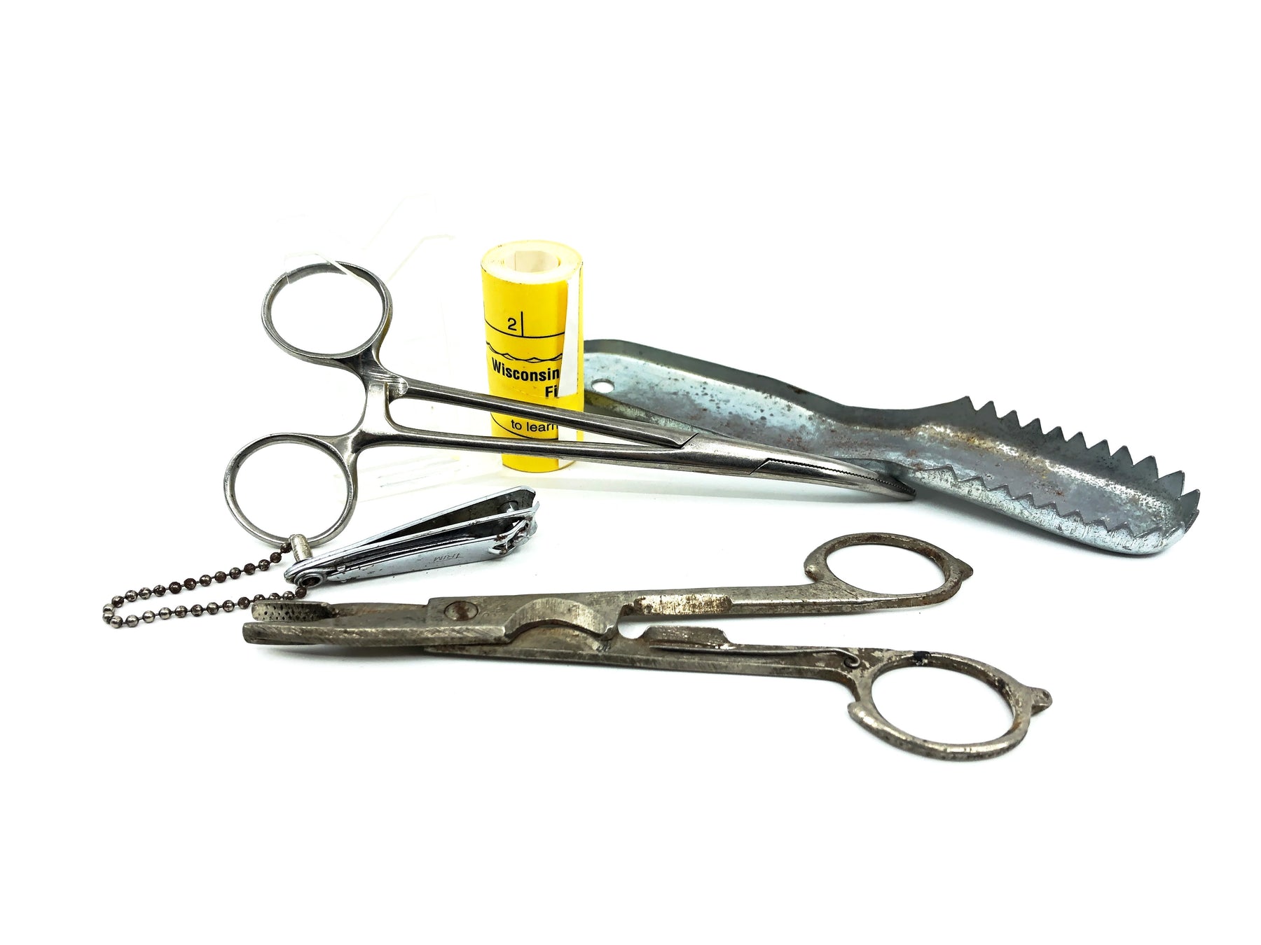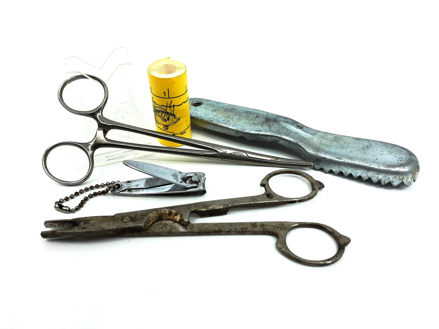 Essential Fishing Tool Pack. This pack includes a variety of essentials tools for any fishermen's tackle box. All these objects are used or vintage with varying degrees of wear but are still in overall good condition. From cutting line, removing lures, descaling measuring and more. Good stuff to fill up your tacklebox at a bargain price.