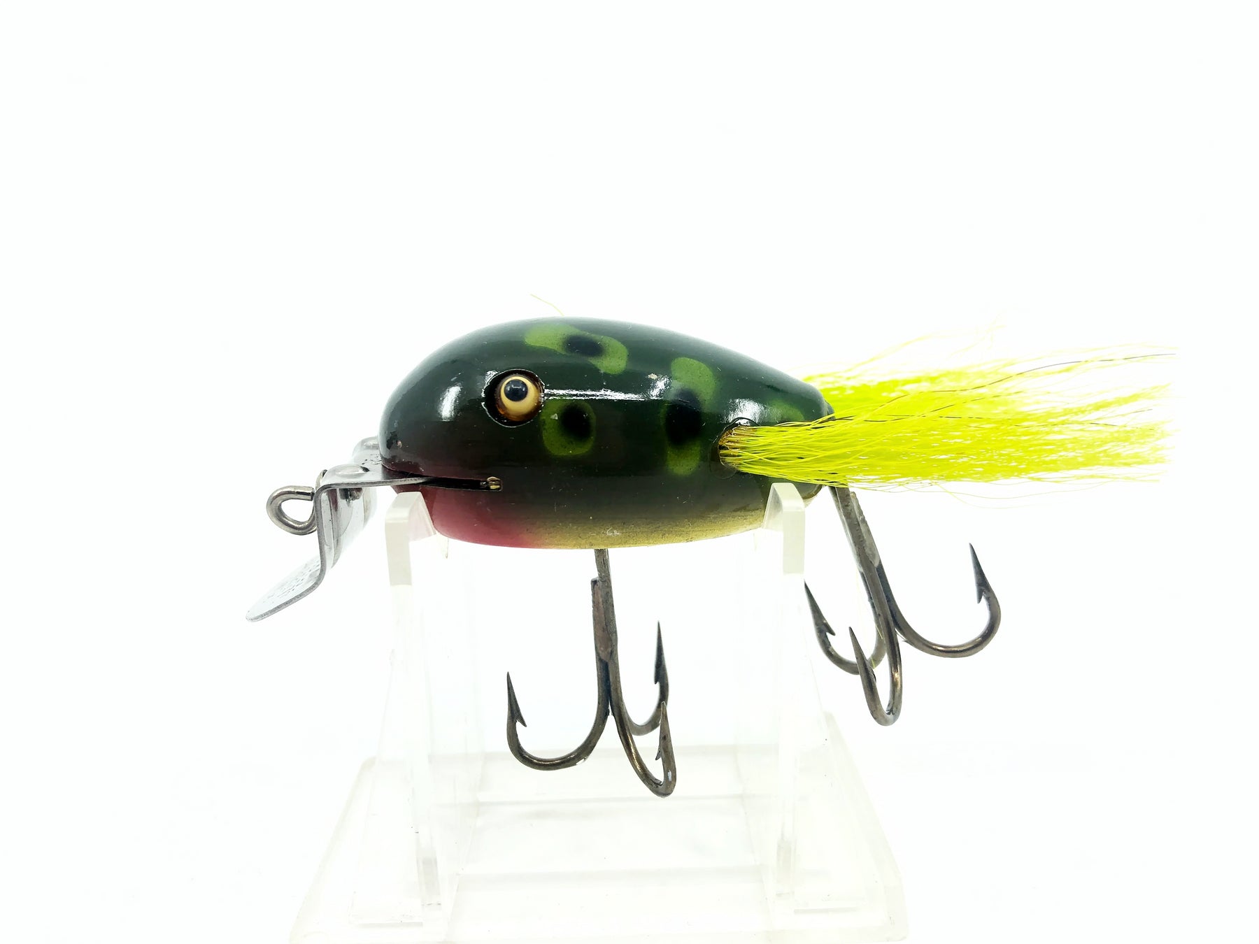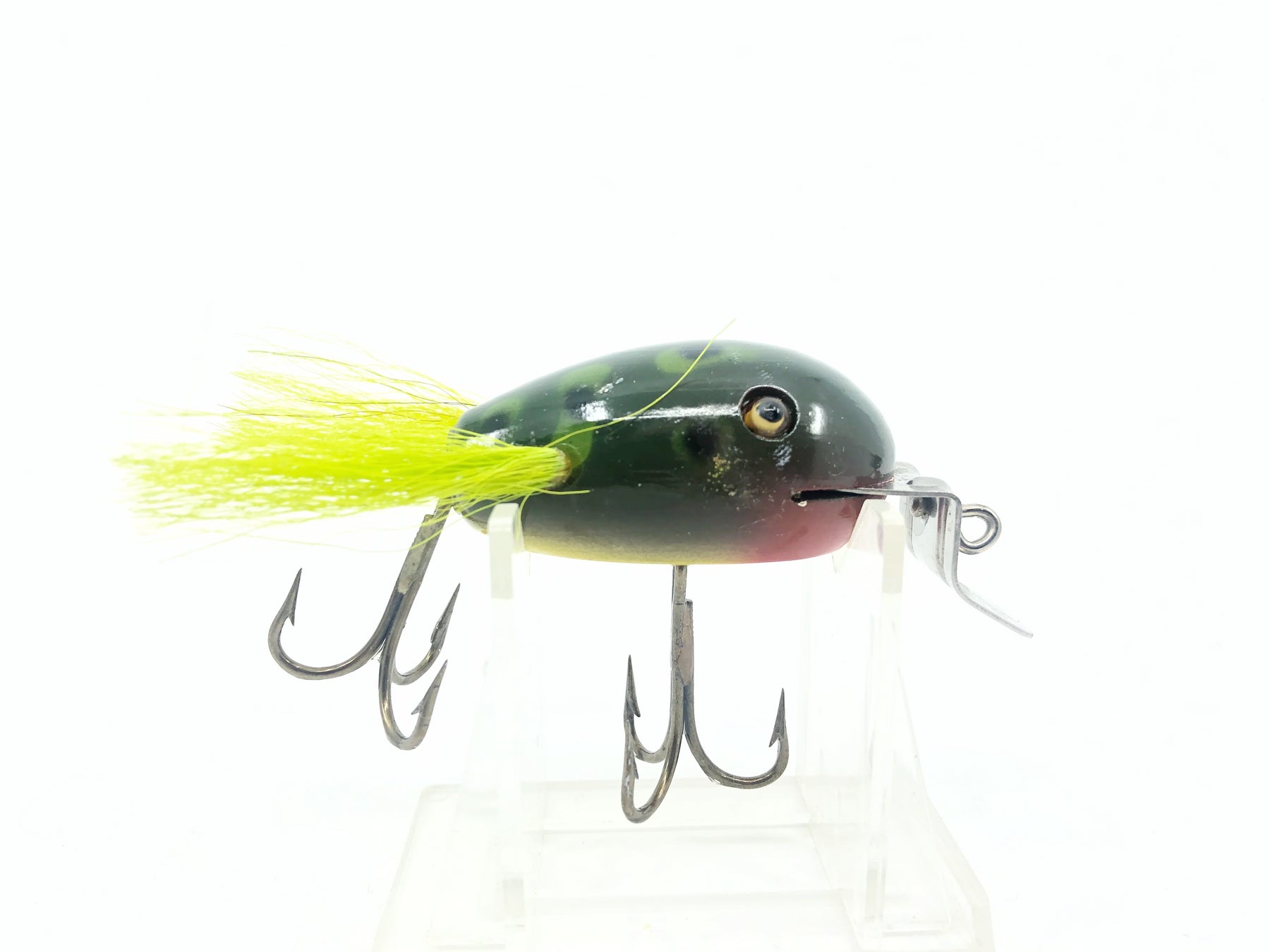 Creek Chub 5100 Dingbat, Frog Color 5119. Made between 1937-1958. Easily one of Creek Chubs most famous and identifiable lures. About 2" long body. This Dingbat has some minor wear as shown but overall good condition, see photos. Wooden lure, glass eyes. Tough to find. A classic bait!