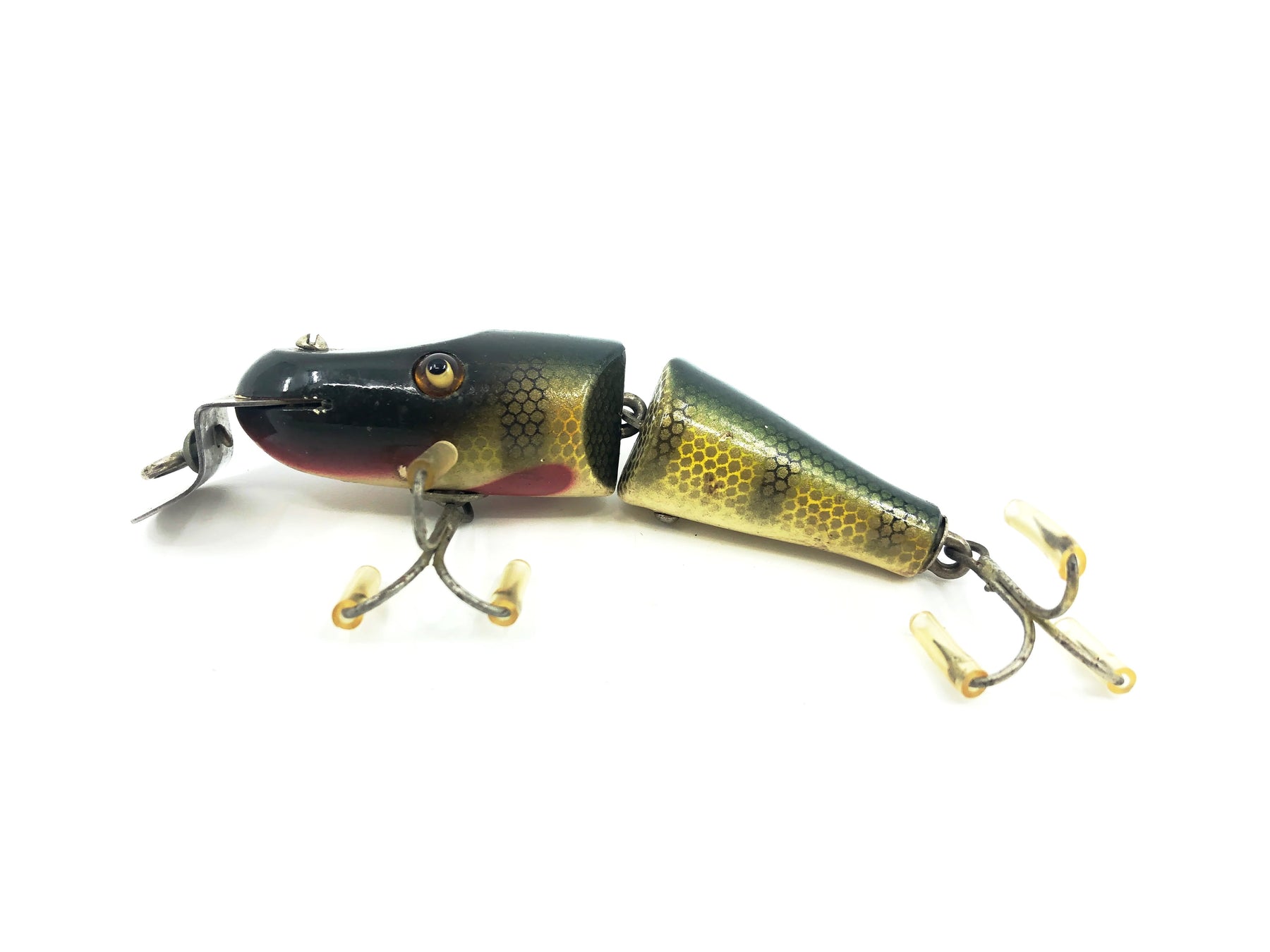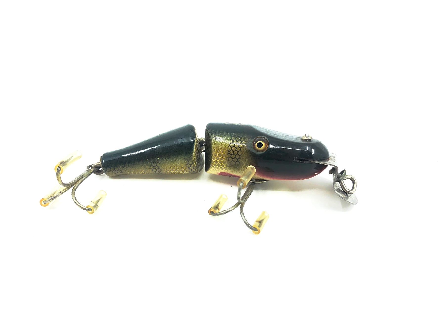 Creek Chub Wooden 2700 Baby Jointed Pikie Minnow, #01 Perch Color. Great wooden Creek Chub with glass eyes. About 3 1/2" long. The Creek Chub Baby Jointed Pikie was made from 1927 - 1963 in wood and was one of the more famous Creek Chub lures. This one is used with some wear but in overall good condition, see photos. Collect or fish this great vintage lure.
