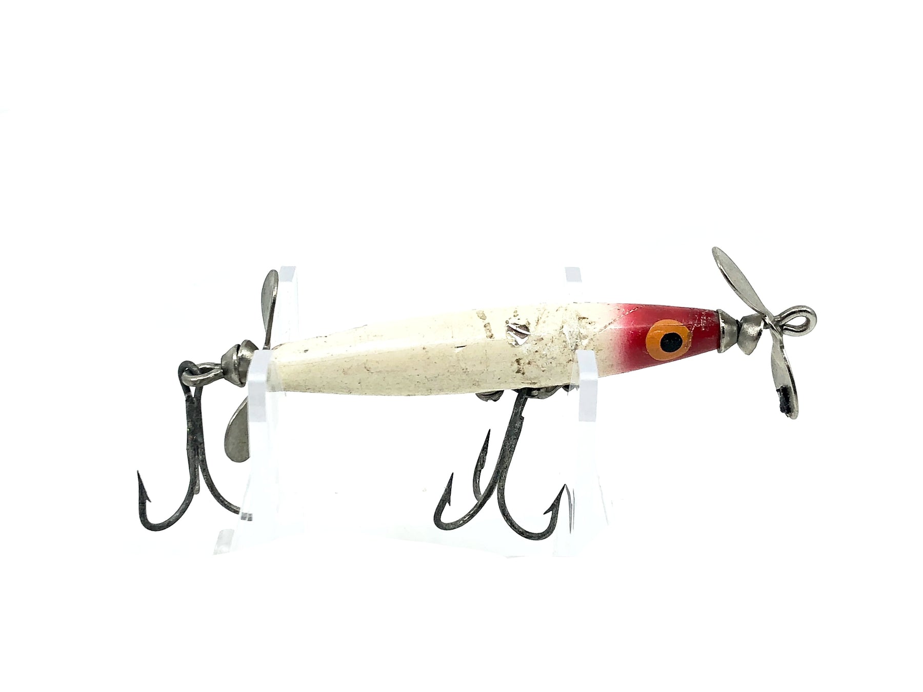 Bomber Spinstick 7200 Series, Red/White Color. Great wooden bait here. About 2 1/4" long body. Lure is used with some wear and paint smudging but in overall ok condition. This discontinued lure offers unique top water action, fish or collect. See photos.