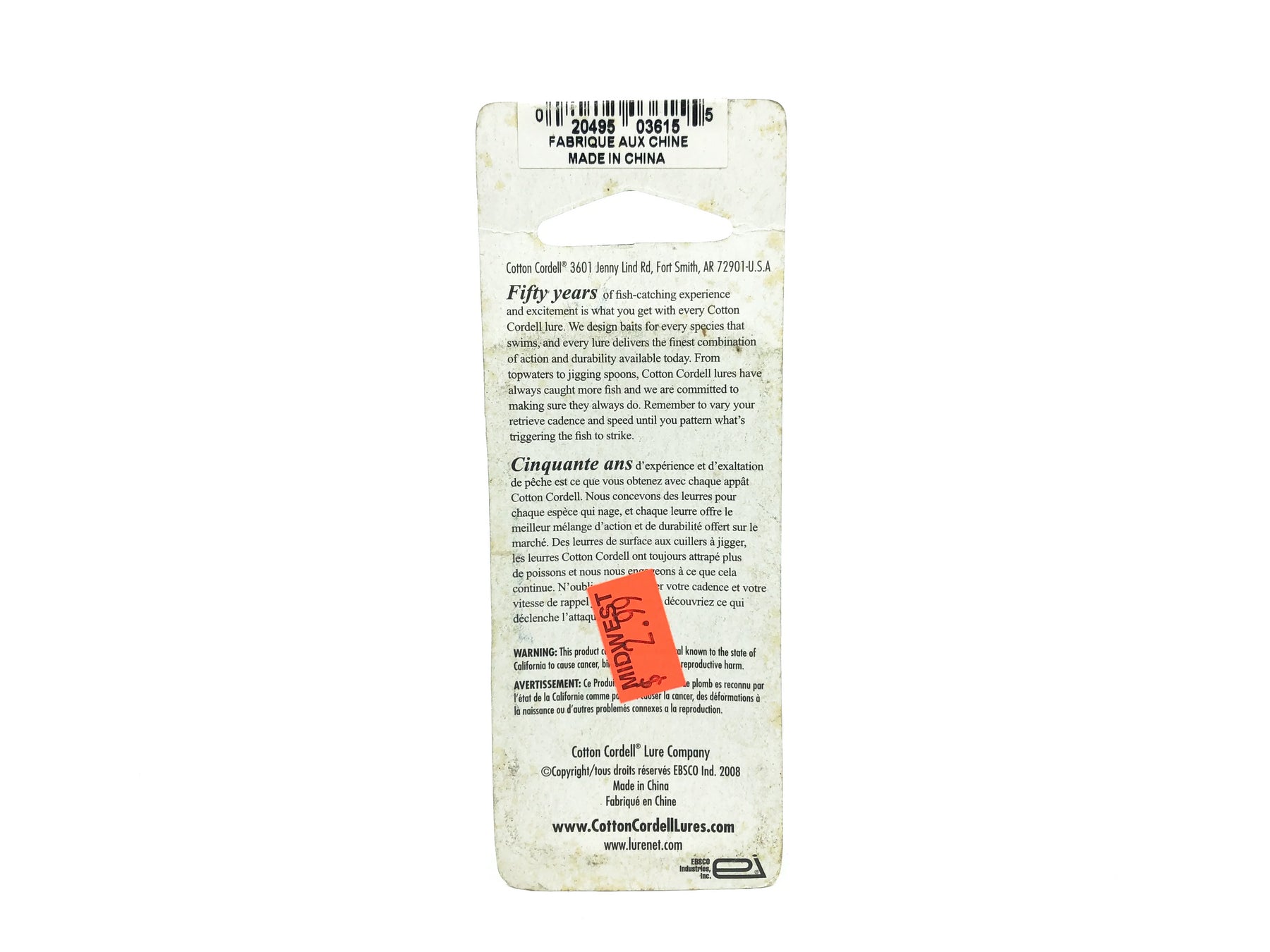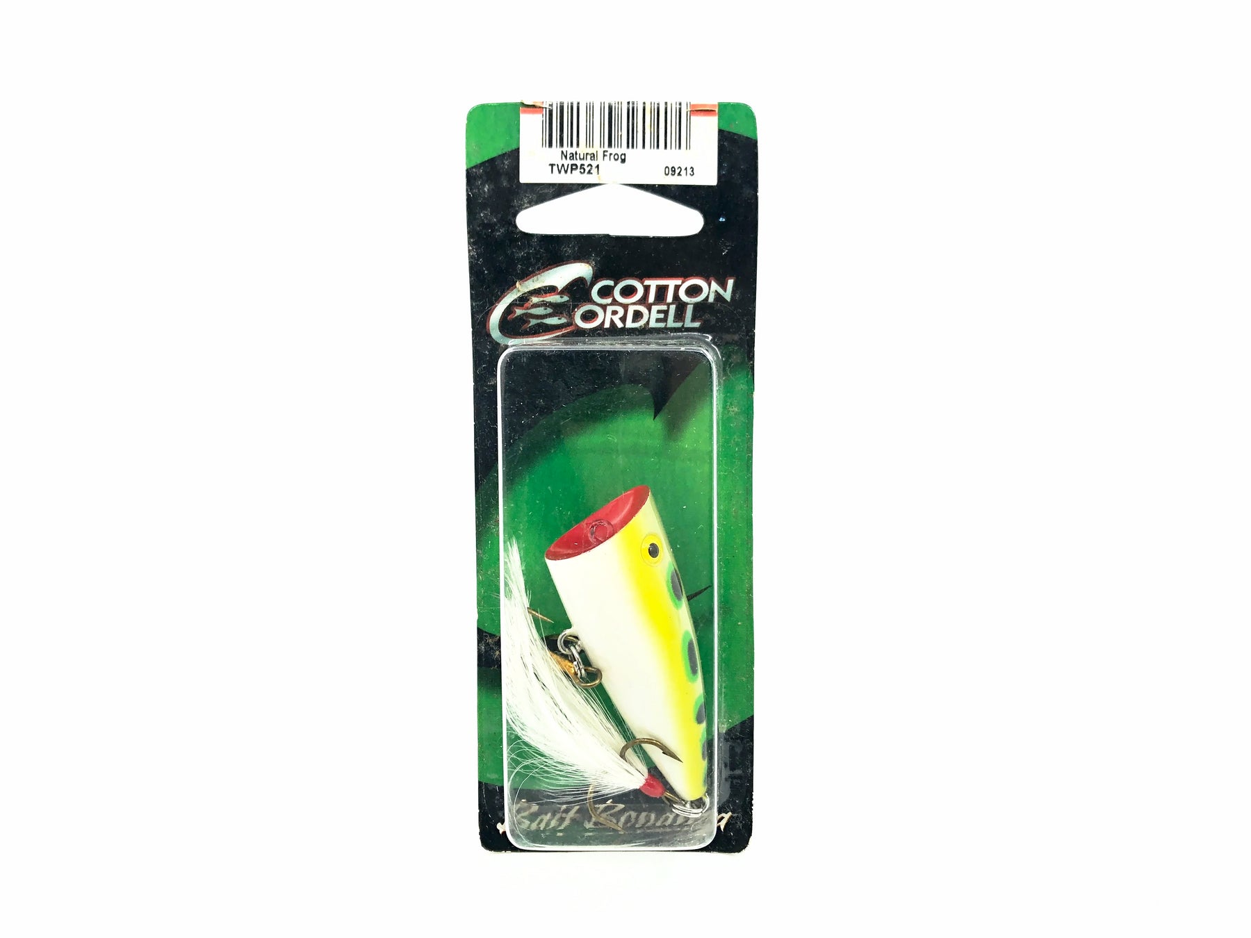 Cotton Cordell Popper, Natural Frog Color on Card. This lure is about 2" long. Card has some wear as shown but overall good condition, lure is new on card. This comes from a lot of old stock from around 2008. See photos.
