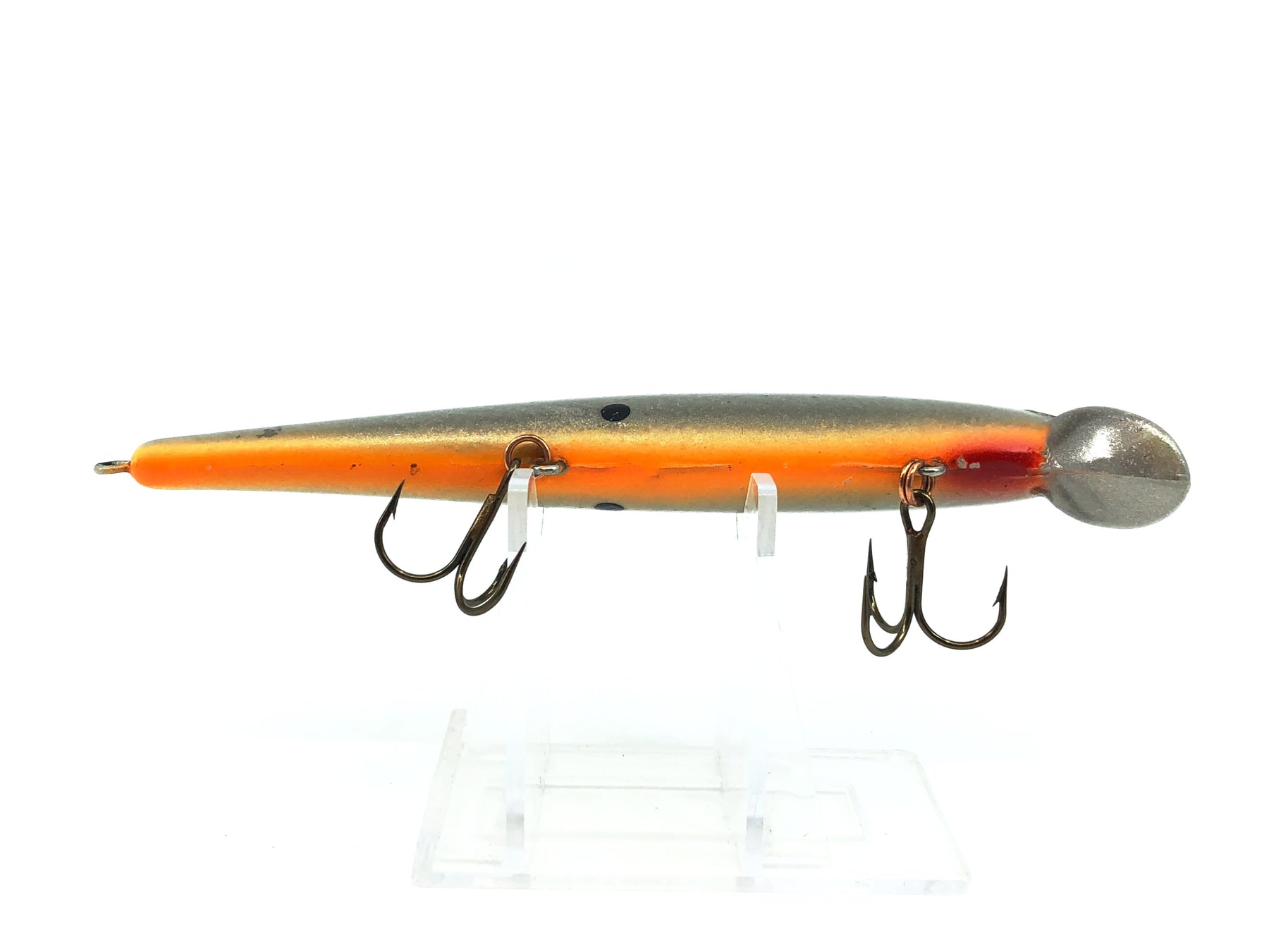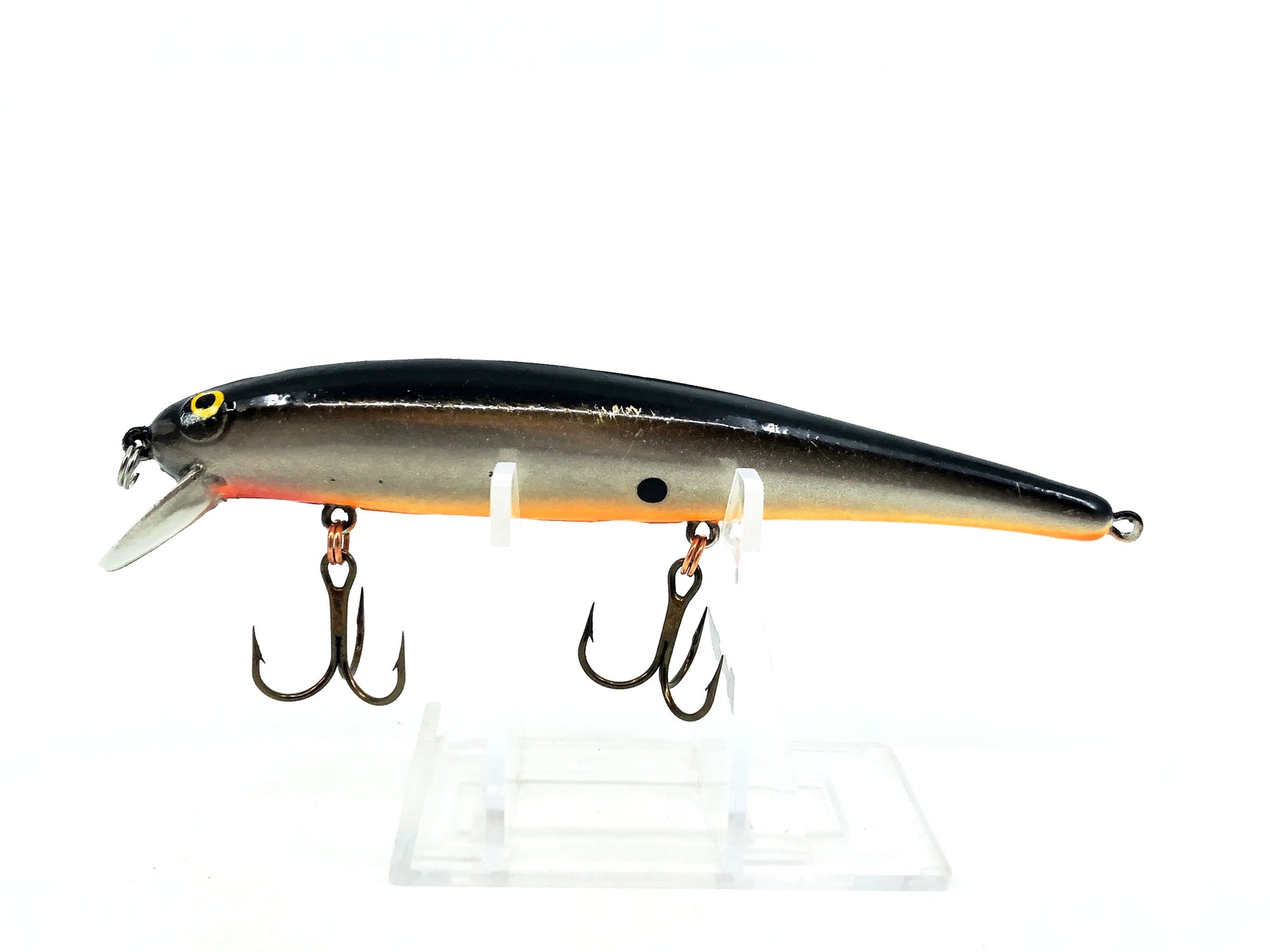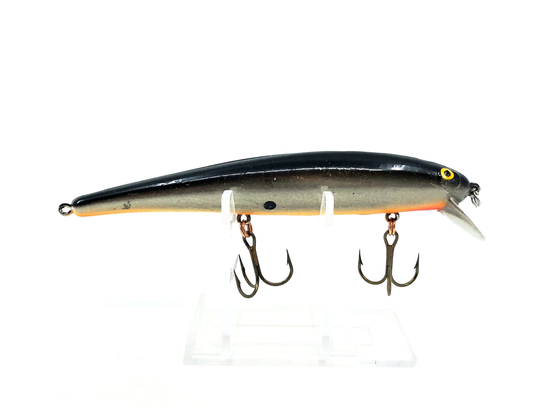 Bomber Long A 15A, APBO Pearl Black Back/Orange Belly/Black Dots Color. About 5" long. Lure is used but in good condition with minor wear and a missing back hook. Perfect to fish or collect. See photos.