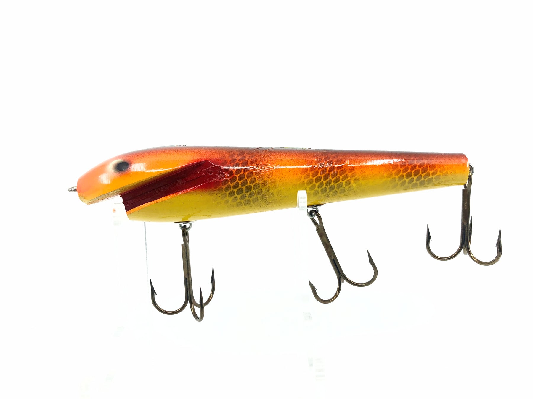 Fudally's Reef Hawg, Flame Color. Quality wooden musky bait! Lure is about 6 1/4" long. This bait is used but appears to have never been fished before and is in overall great condition. See photos.