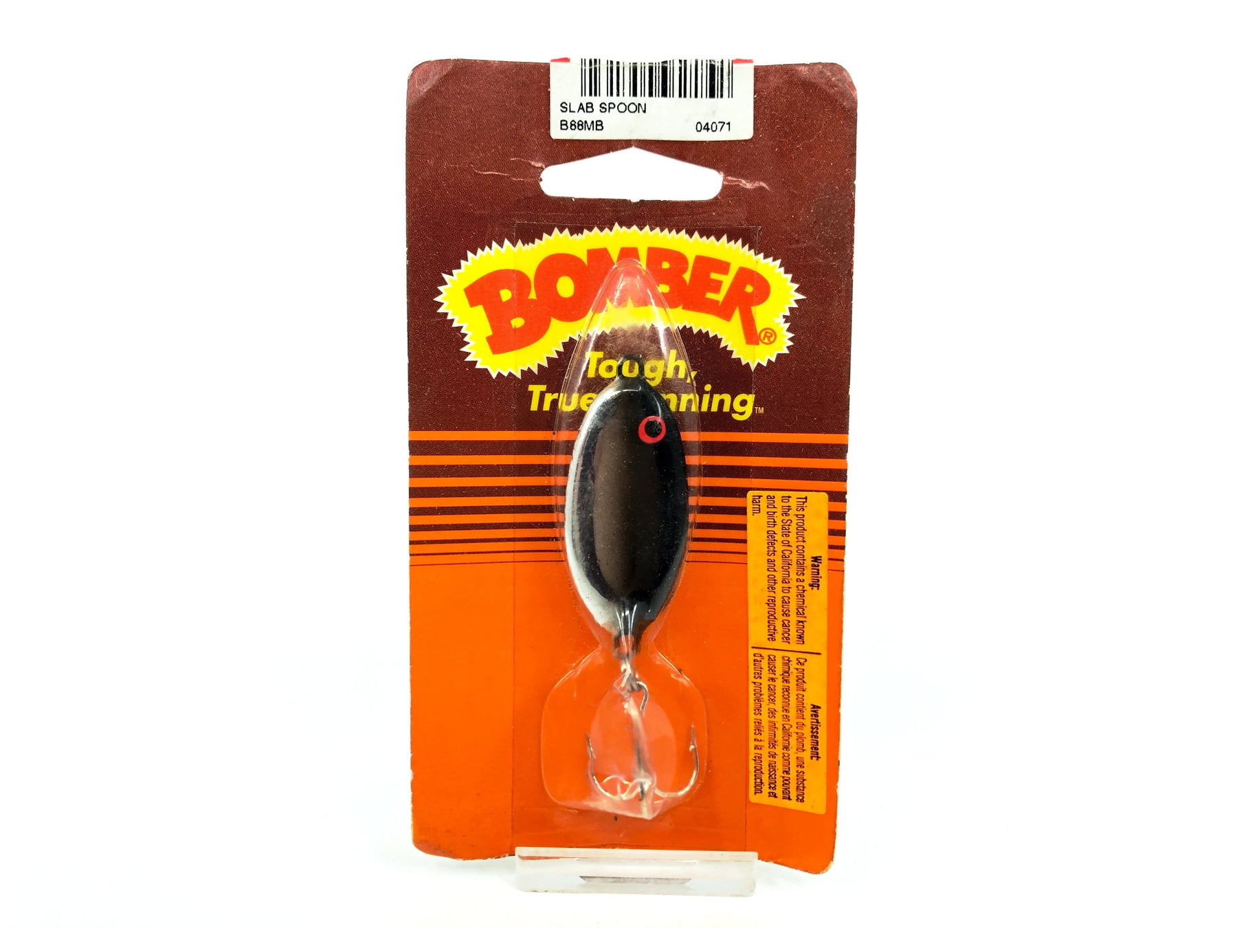 Bomber Slab Spoon B88MB, Metachome Metallic/Black Back Color New on Card. Lure body is about 1 1/2" long. Old stock that dates back to 2003. Brand new on card. Card in good shape, lure new on card. Fish or collect a classic bait. See photos.