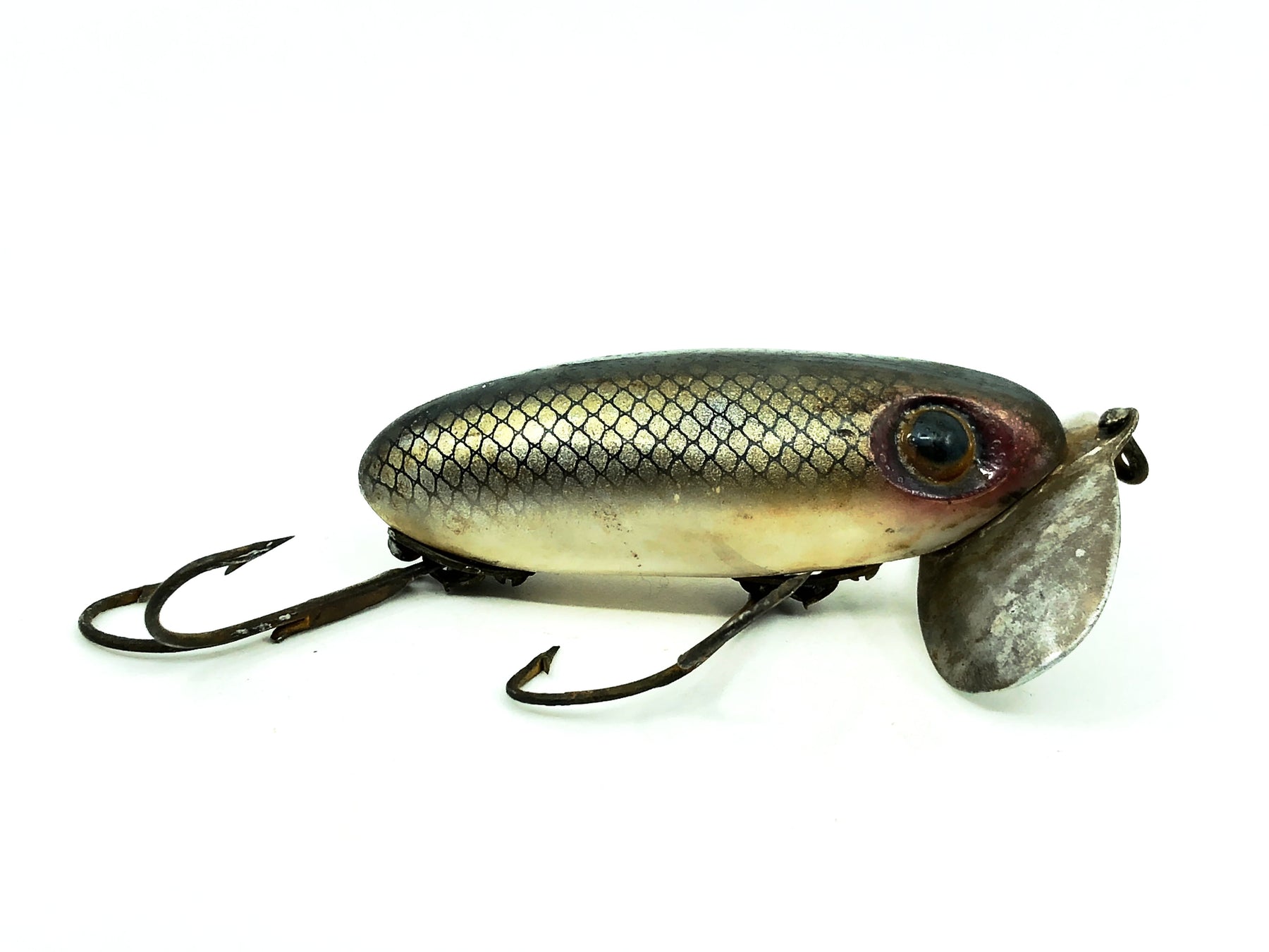Arbogast Jitterbug 5/8oz, Shad Color, Double Hooks Model. Earlier Bugged-Eyed Jitterbug with early surface hardware and double hooks. Body is about 2 5/8" long. Lure is used with some wear and marks but in overall good condition. Fish or collect, see photos.