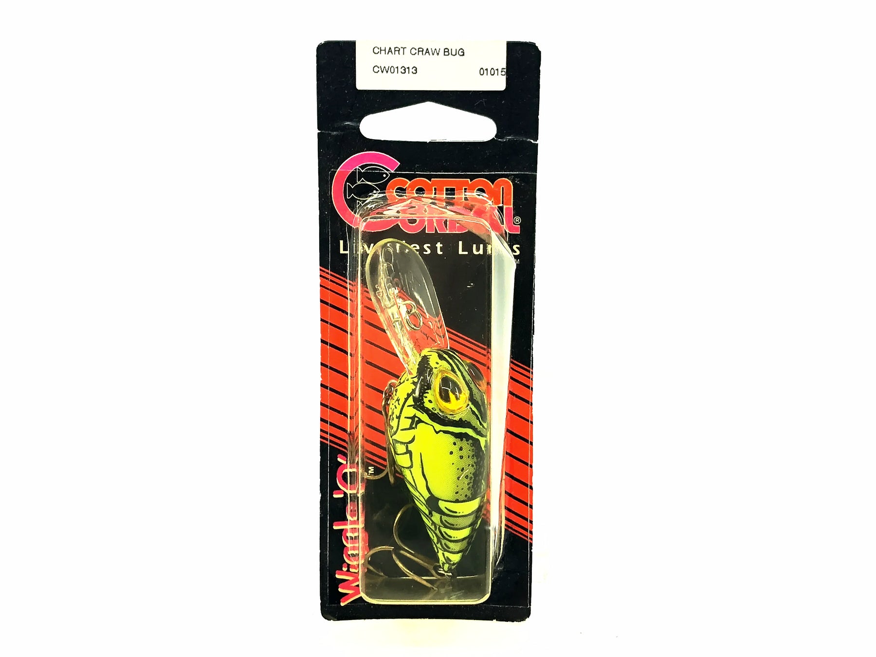 Cordell Wiggle-O, Chartreuse/Craw Bug Color on Card. Lure is about 2" long not including lip. Great for fishing or collection. Lure is new on card. The card is in good condition aside from minor dents and uv staining. See photos.