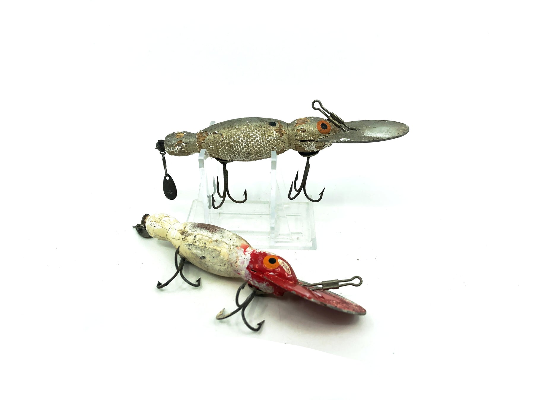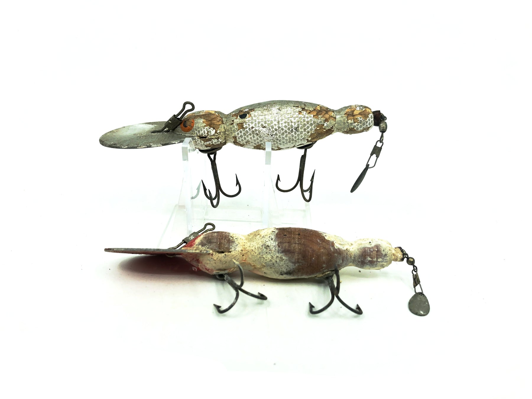 Bomber Wooden Water Dog Combo, #04 White/Red Head/#40 Silver Shad Color. Both are about 4 1/2" long including the lip. Both lures have considerable wear and missing paint but are still in ok shape, see photos. Fish or collect.