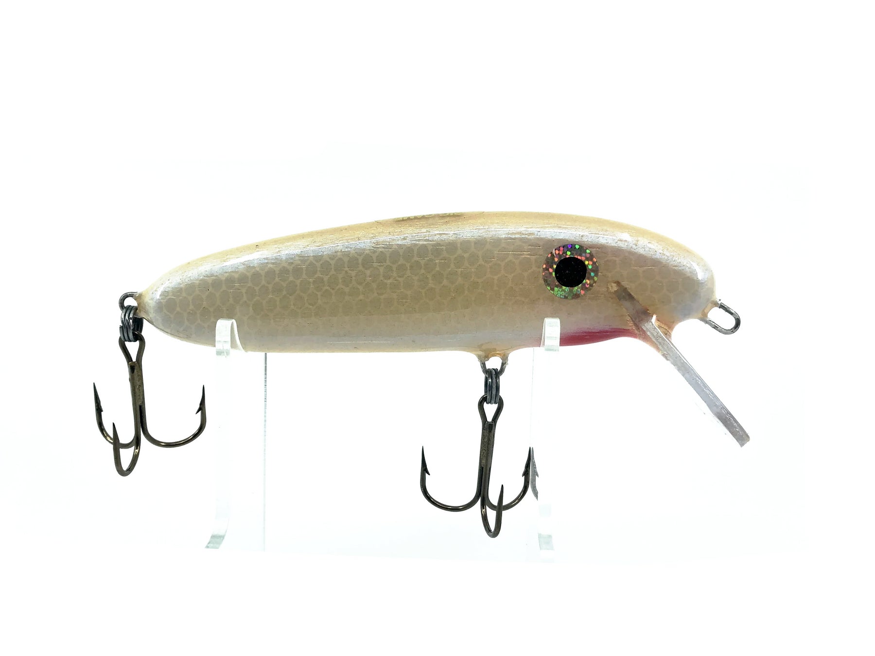 Big Game Tackle 5" Balsa Twitch, Pearl Shiner Color. Great durable wooden musky bait. Lures body is about 5 1/8" long and weighs 1 1/2oz. This lure runs from 0-5 feet. This lure is used with very minor wear and in overall great condition. Fish this great lure, see photos.