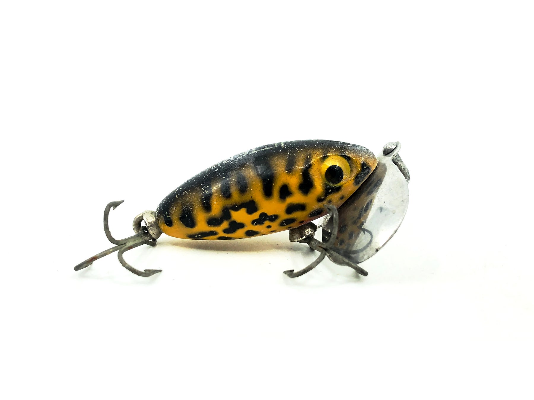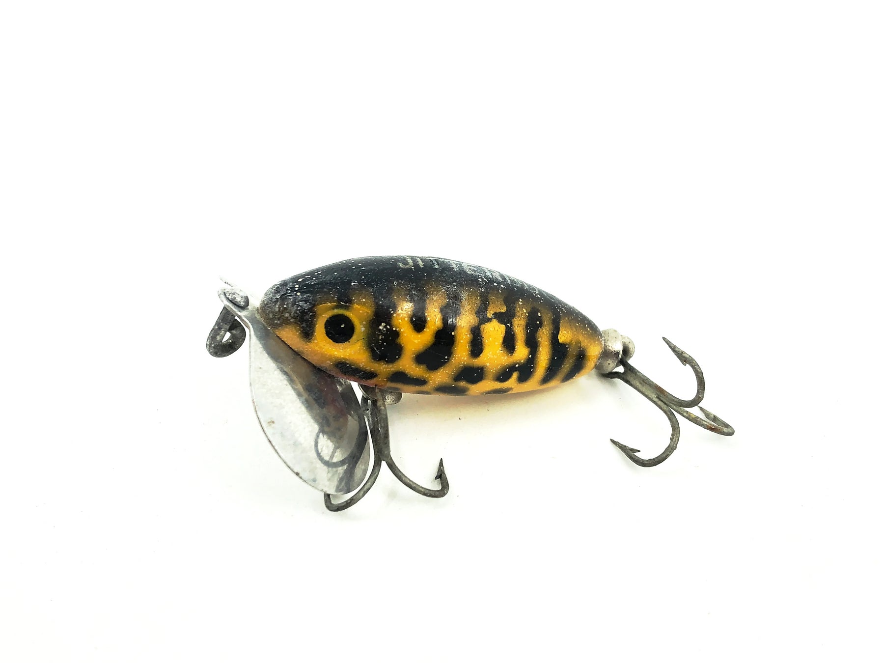 Arbogast Jitterbug 1/4oz, Yellow Coachdog Color. Body is about 1 3/4" long. Used with only some marks and plastic waxing but overall still in good condition. Fish or collect, see photos.