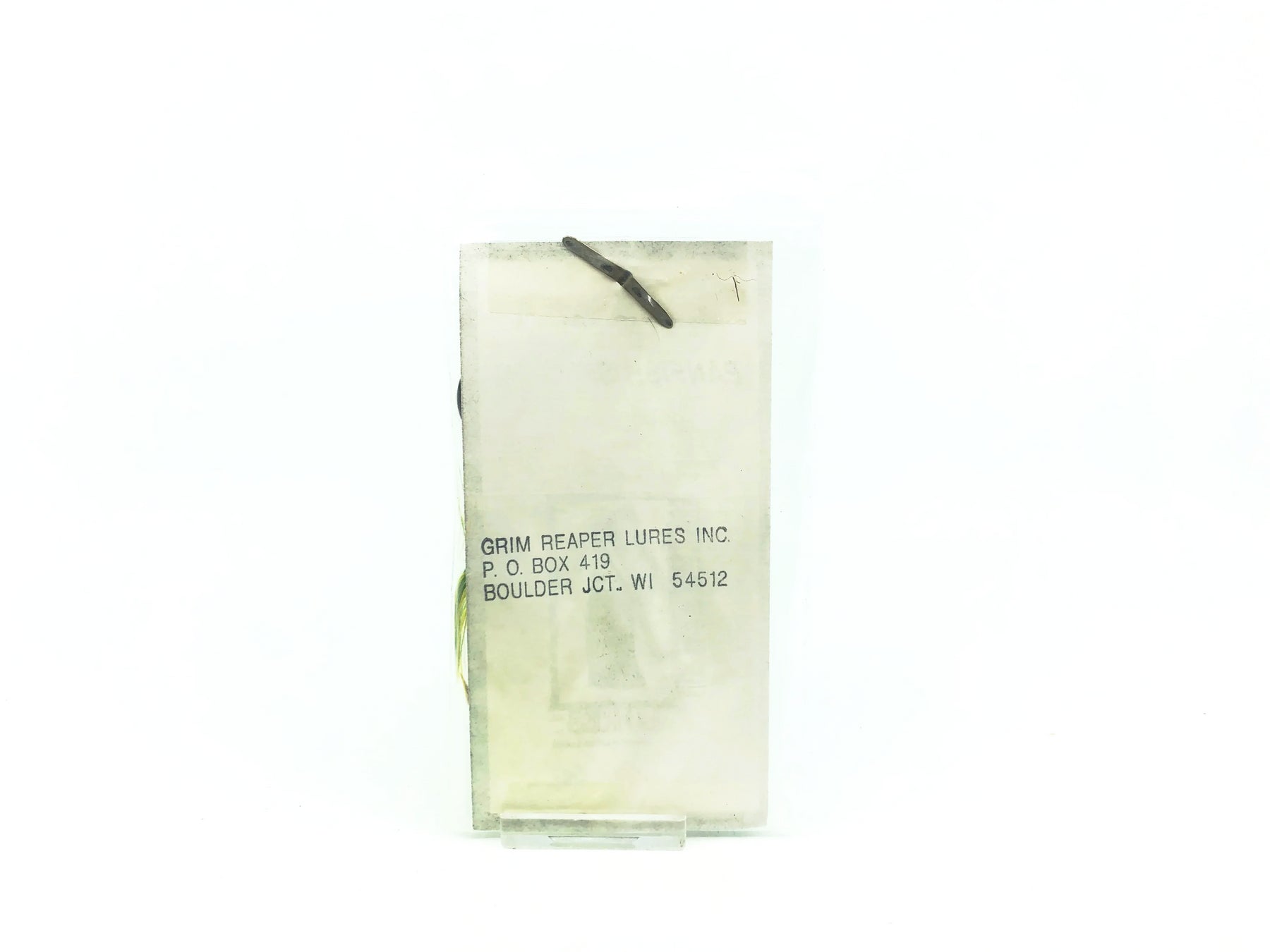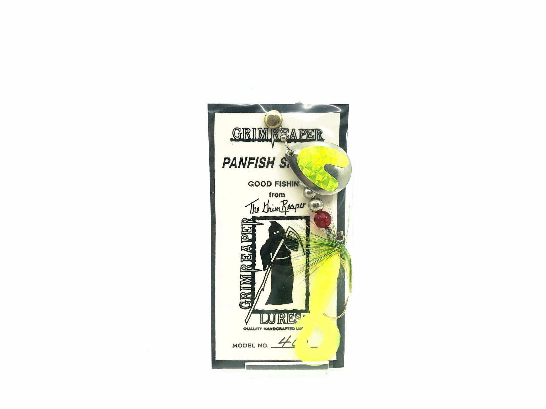 Grim Reaper Panfish Spinner 400, Silver Blade/Chartreuse Flasher & Tail on Card. Grim reaper bait that's been discontinued for a number of years. Lure is about 3 7/8" long excluding the tail This bait is still attached to the card and the card is in good condition. See photos.
