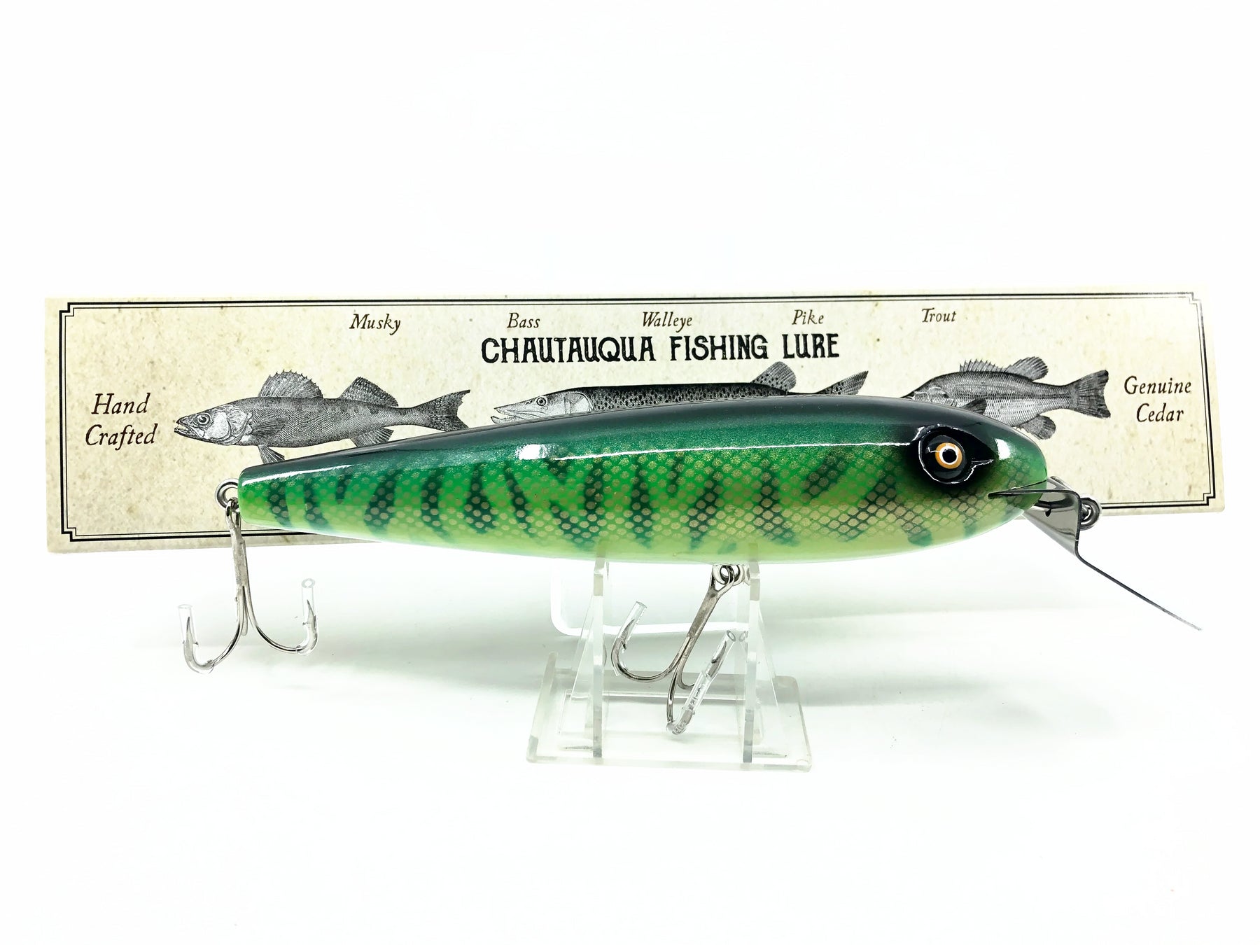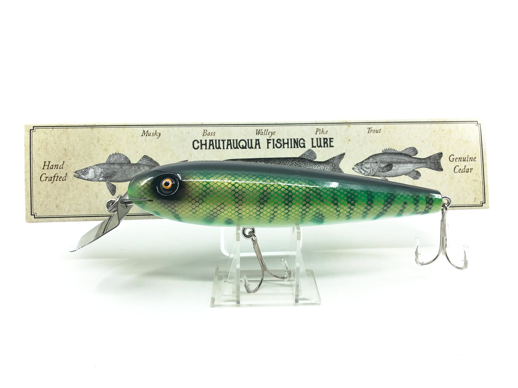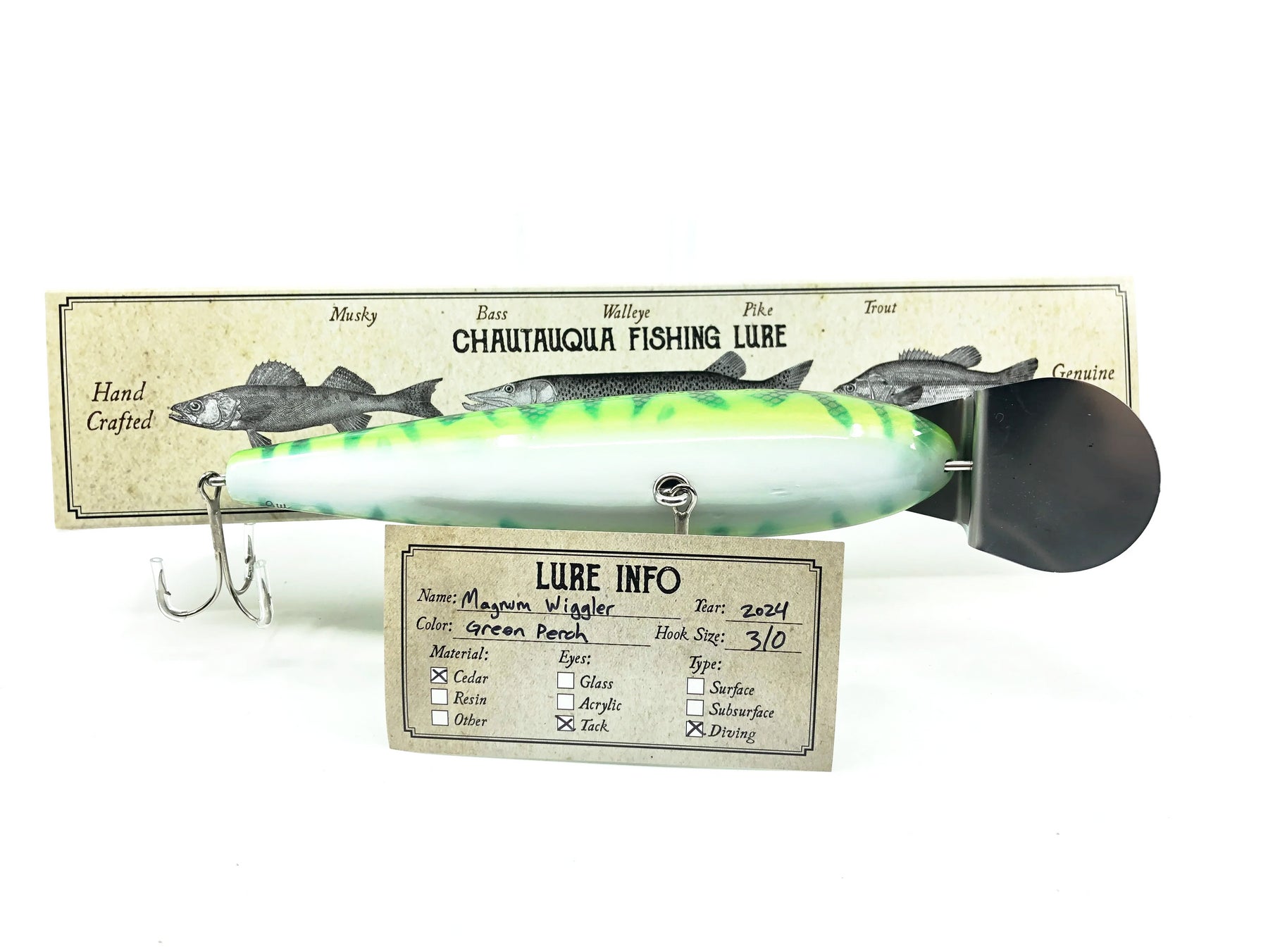 Chautauqua Magnum Wiggler Green Perch Color.  The latest creation from the artist at Chautauqua, the Magnum Wiggler.  Each lure is hand made, crafted and tank tested.    Measure roughly about 7" long body not including the lip.  Each lure hand painted.  Artist initials on each lure.  Truly a work of art but equally fine to fish.  Like stepping back in time to what fishing lures used to be.  These are not expected to last long so grab them while you can.