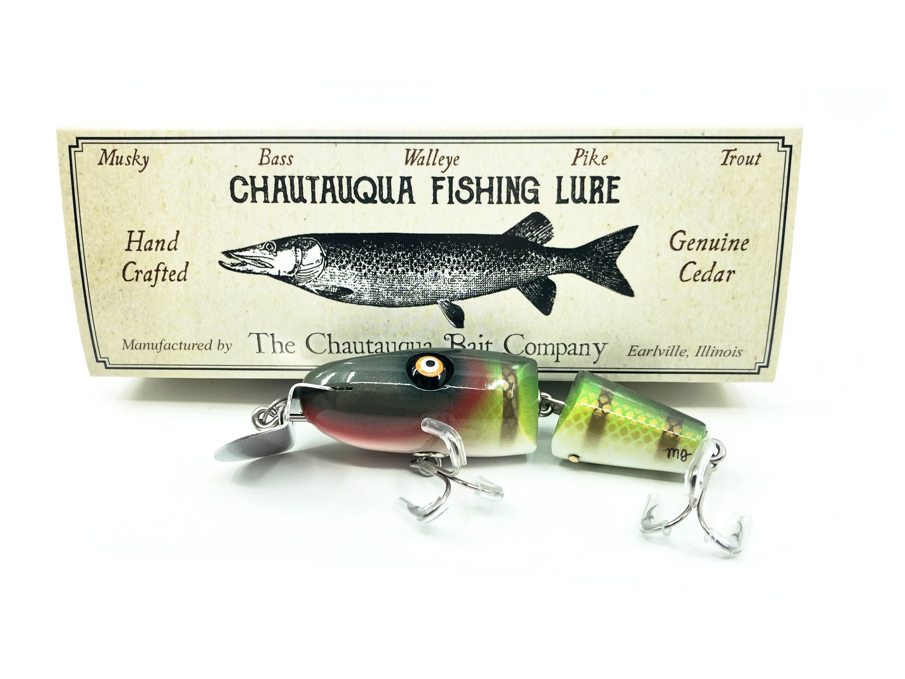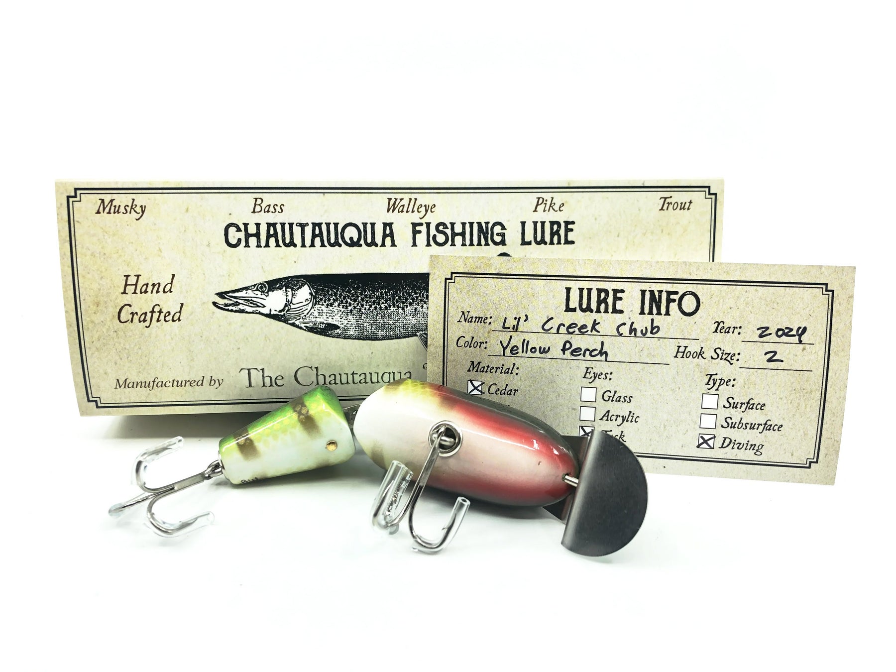 Chautauqua Lil' Creek Chub, Yellow Perch Color. At about 3 3/4" long excluding the lip. This classic lure has earned the trust and favor of many seasoned fishermen. A multi-species bait with a high frequency shake that will tempt musky, pike, walleye, and bass. Features an adjustable, stainless steel diving lip.