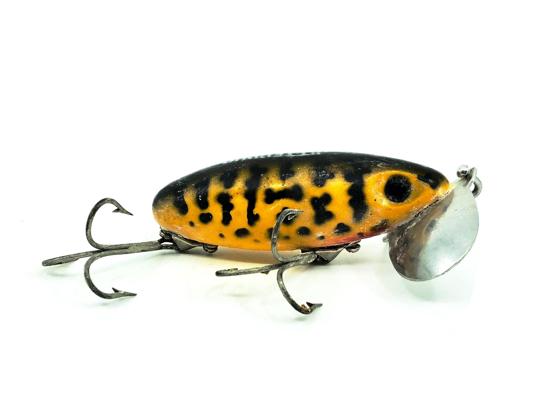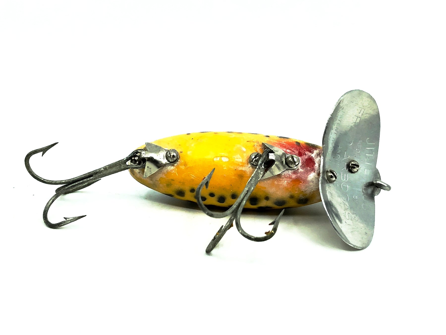 Arbogast Jitterbug 5/8oz, Yellow Coachdog Color. Body is about 2 5/8" long. Used with some wear, marks, and waxing but overall good condition. Fish or collect this iconic lure, see photos.