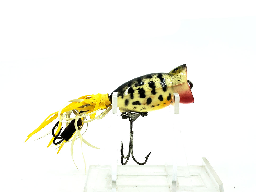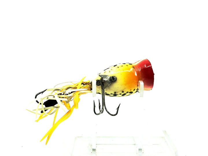 Arbogast Hula Popper 3/8oz, #10 Coachdog Color. Main body is about 2" long. Great vintage model here with its skirt mostly in tact. Lure is used with some wear but overall in good condition. This lure also has an added back hook! Fish or collect. See photos.