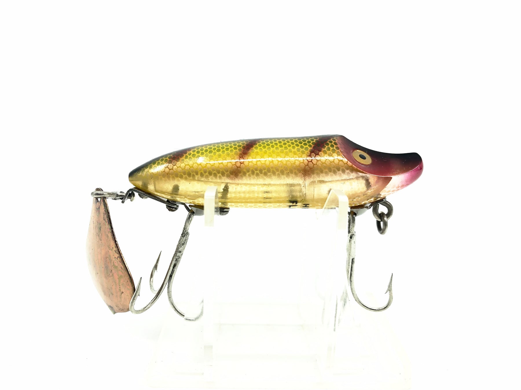 Heddon Flap-Tail Jr. L Perch Color. Harder to find vintage Heddon Plastic bait here. Lure is about 3" long. This flap-tail spook is used but in overall great condition. Fish or collect, see photos.