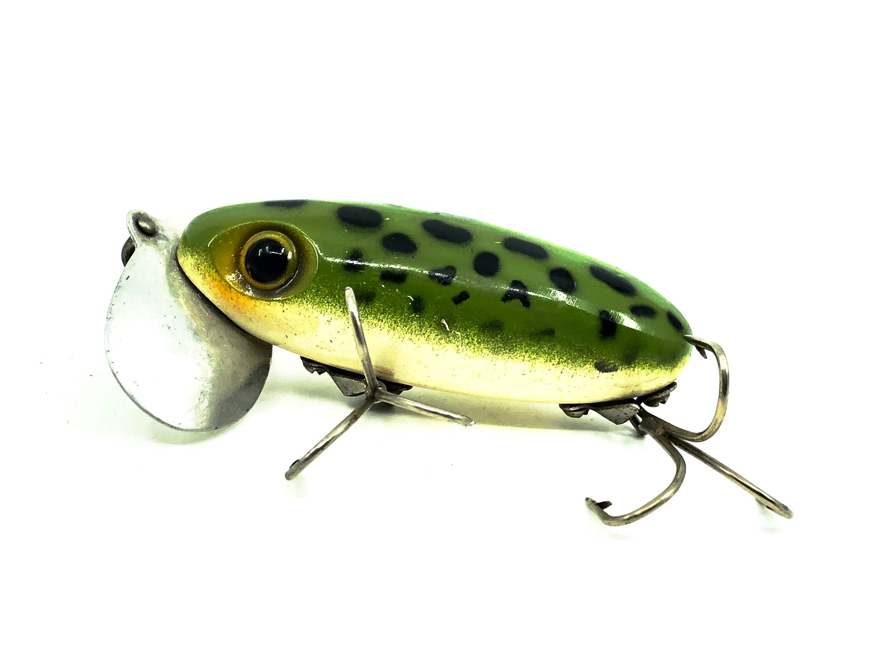 Arbogast Jitterbug 5/8oz, Frog Color, Vintage Bugged-Eyed Model. Body is about 2 5/8" long. Used with some minor wear and marks but overall good condition. Fish or collect this iconic bait, see photos.
