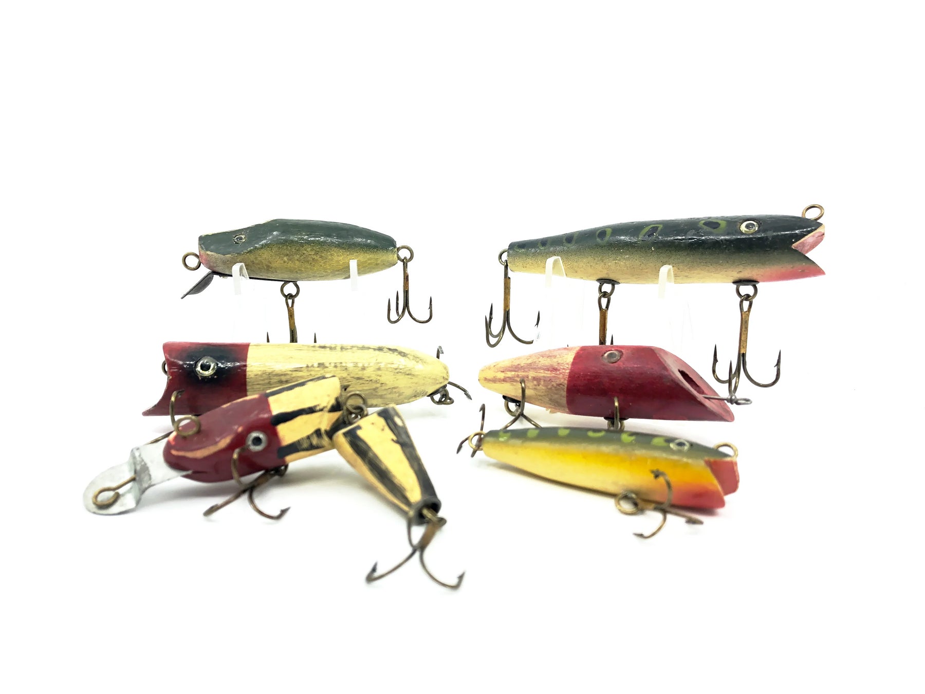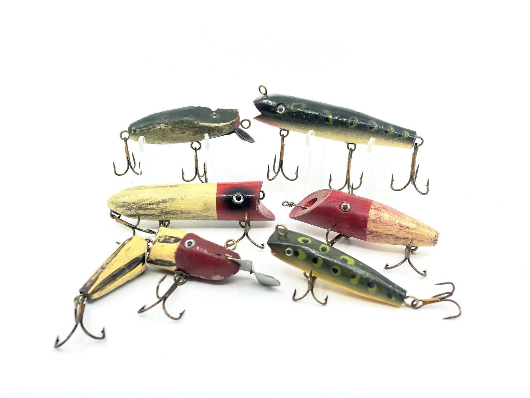 Contemporary/Rebuild Vintage Lure Lot. This lot includes a collection of one contemporary lure and what appears to be five Creek Chub/Shur Strike baits that have had their hardware and eyes replaced. All have wear as shown but still have some life left. Fish or collect, see photos.