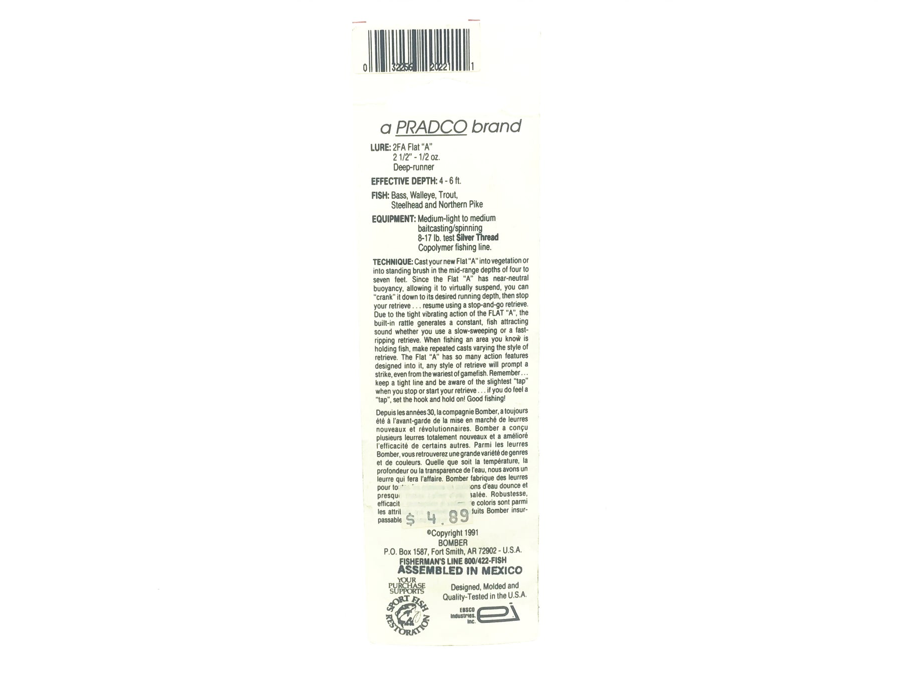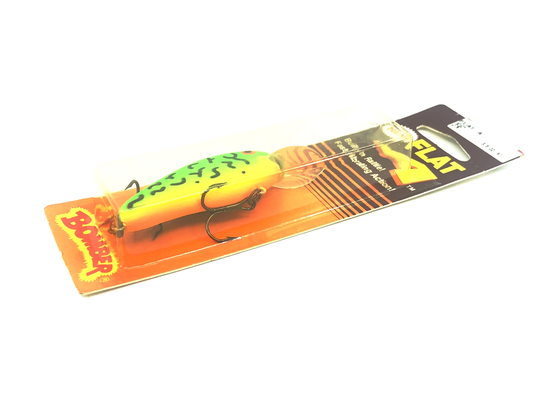 Bomber Flat A 2F, AFT Fire Tiger Color on Card. About 2 3/8" long excluding lip. Lure is new on card. Card is in good condition but with some minor wear, see photos. Fish or collect.