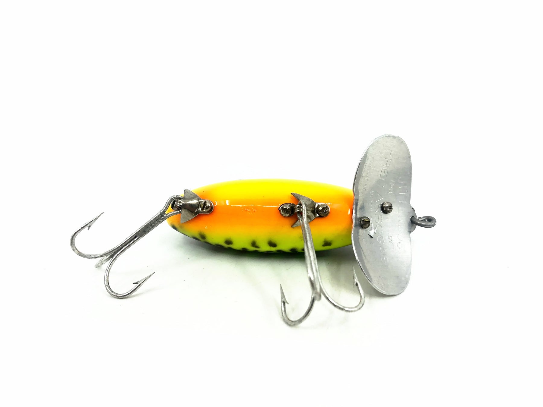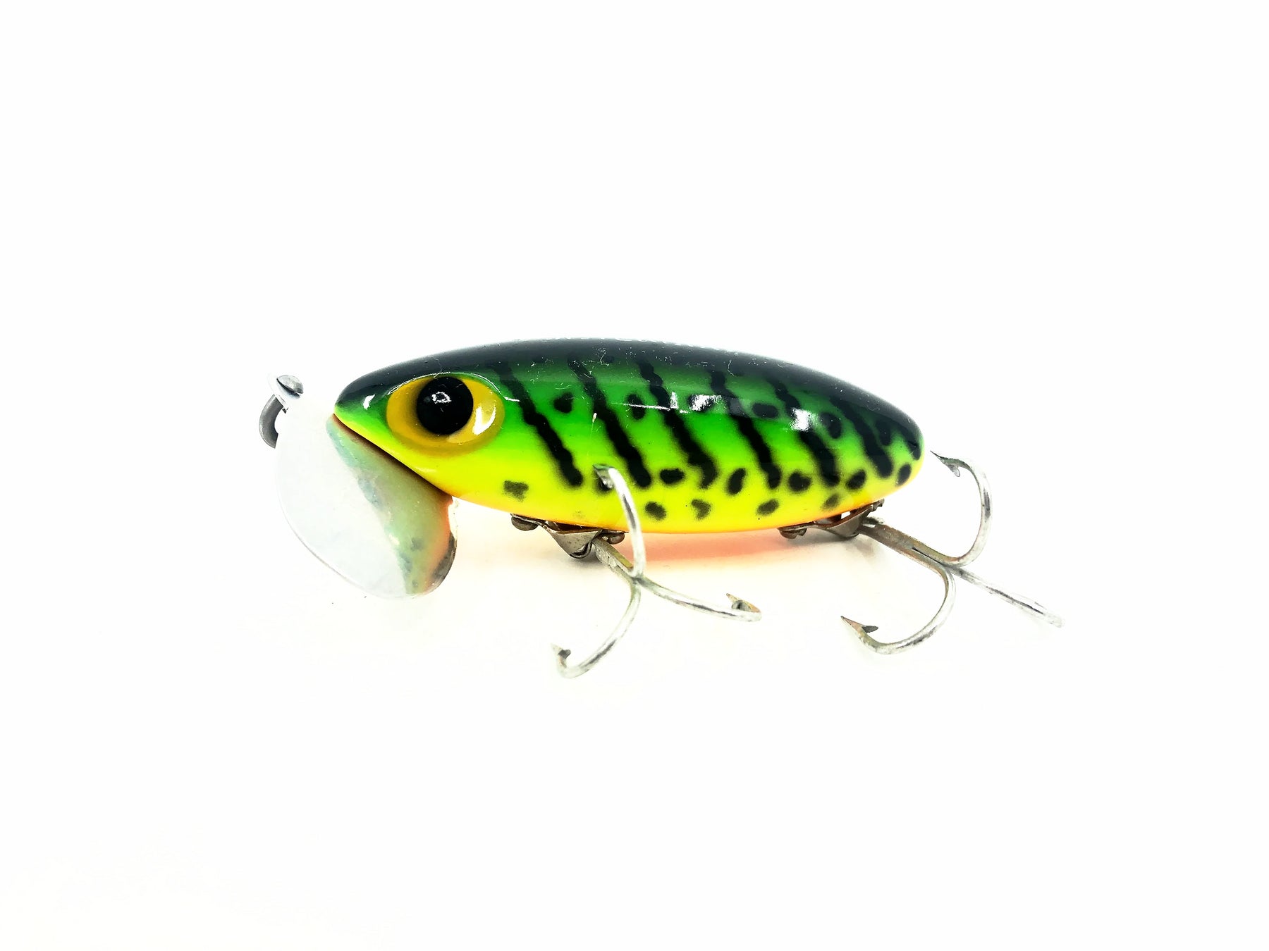 Arbogast Jitterbug 1/2oz, #115 Firetiger Color. Newer Pradco variant of this color, but still hard to find. Body is about 2 1/2" long. Used with some wear and marks but overall good condition. Fish or collect this iconic lure, see photos.