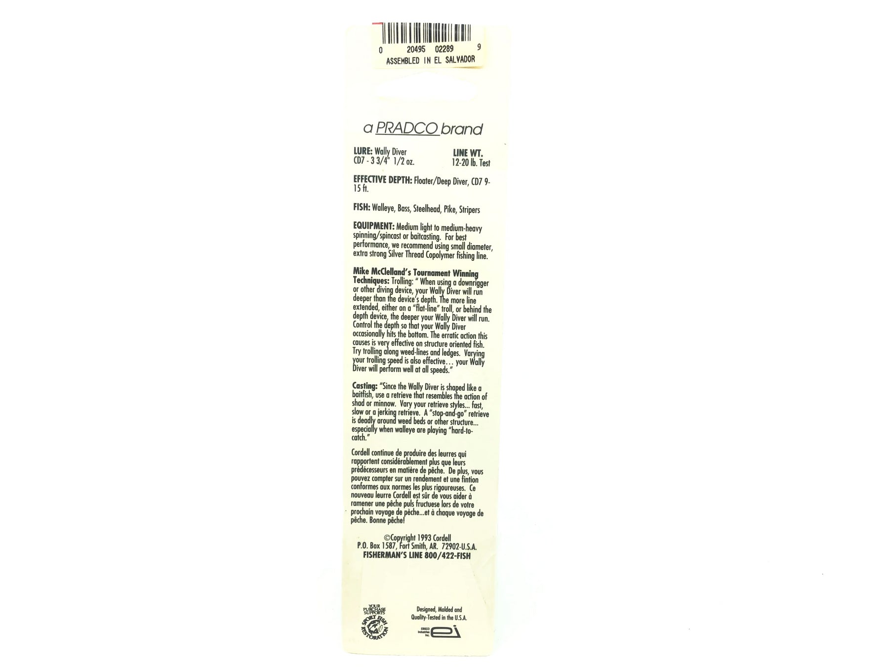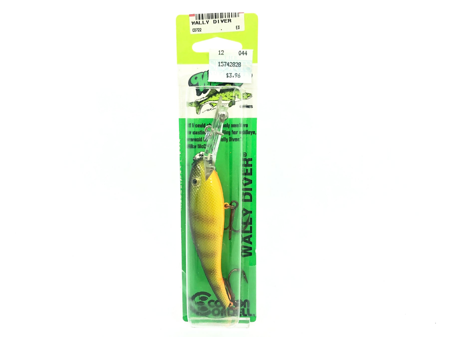 Cotton Cordell Wally Diver CD-7, #22 Perch Color on Card. About 5" long including lip. Card has some minor wear and the bubble is taped on, lure is new on card. Great to fish or collect. New old stock here. See photos.