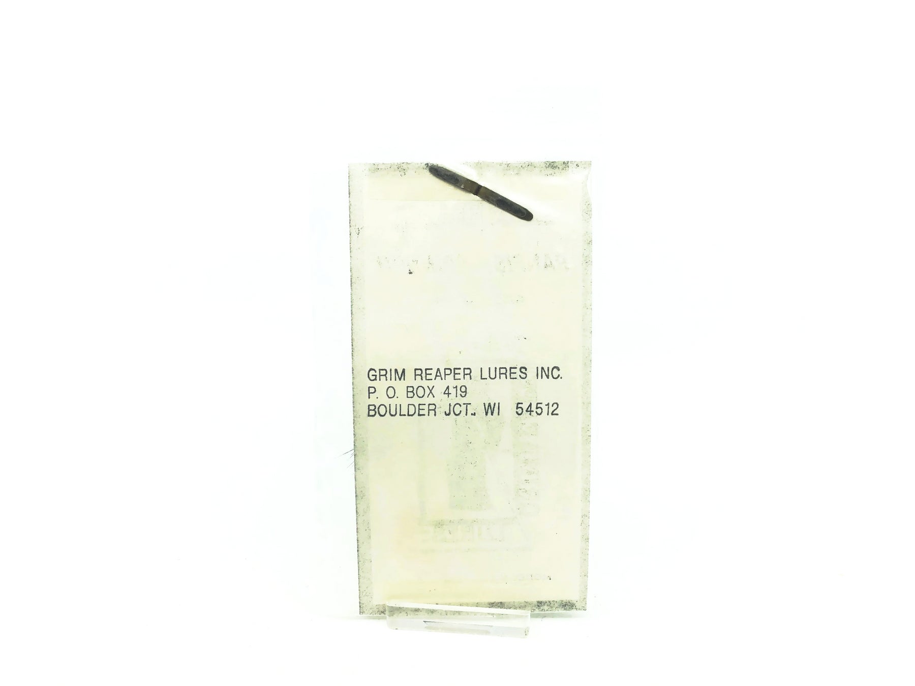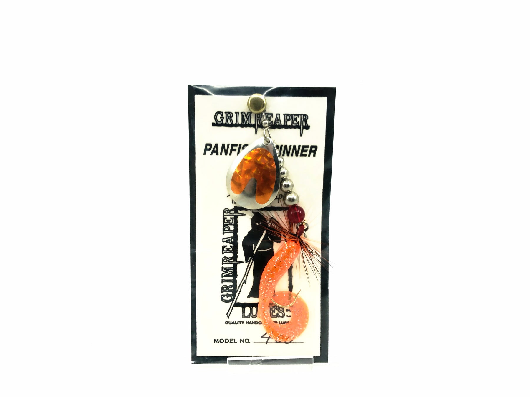 Grim Reaper Panfish Spinner 400, Silver Blade/Copper Flasher & Tail on Card. Grim Reaper bait that's been discontinued for a number of years. Lure is about 3 7/8" long excluding the tail. This bait is still attached to the card and the card is in good condition. See photos.