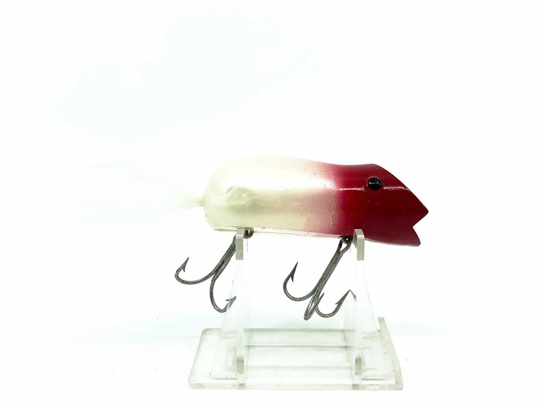 Creek Chub 6580 Mouse, Red/White Color.  About 2 3/4" long body.  Used vintage lure with some wear and waxing as shown but still in overall good condition.  See photos.  Made from 1957-1978 by the Creek Chub Bait Company.  Note, it does have the tail, just blends into the background.