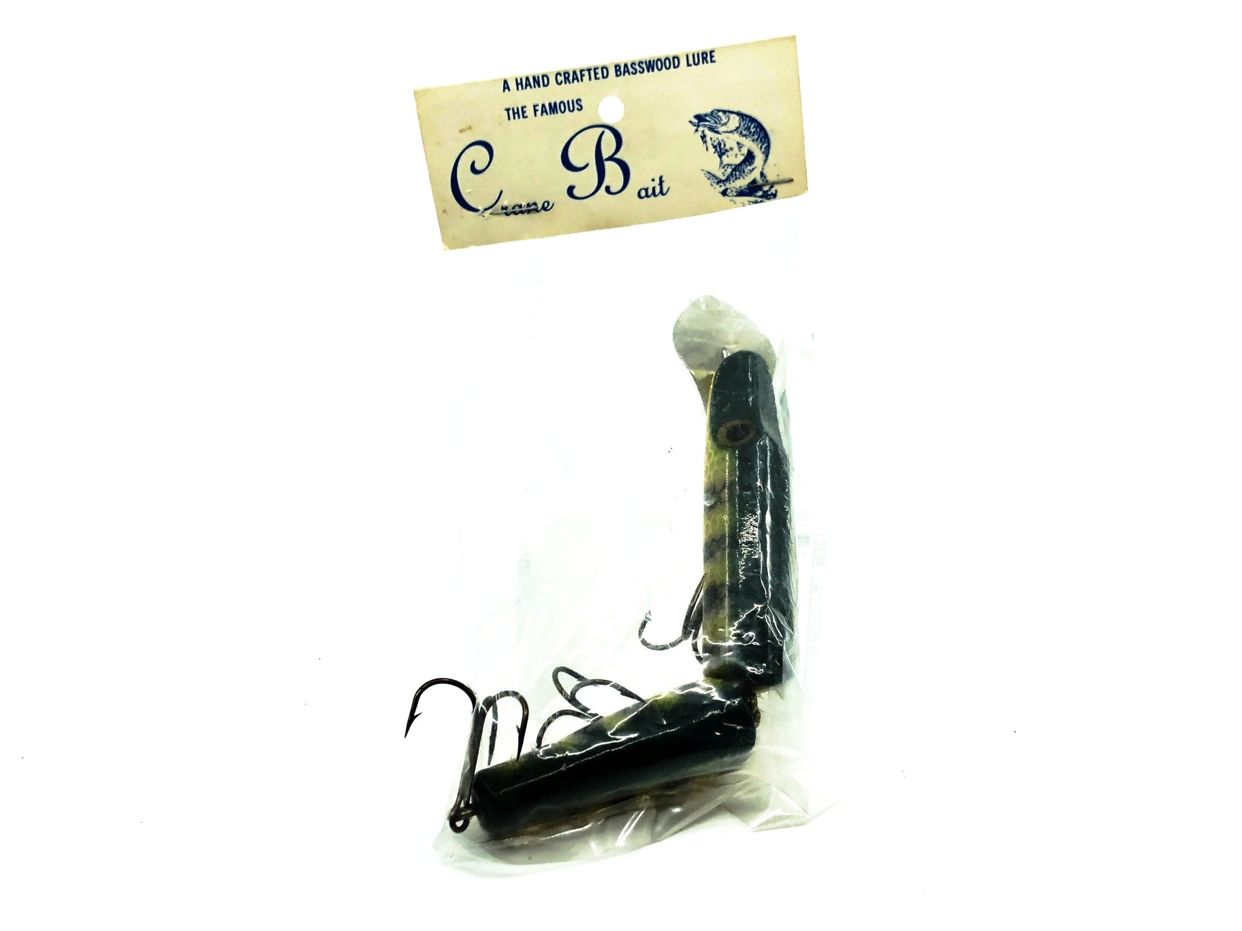 Crane Jointed Pikie Musky Lure, Green Perch/White Belly Color on Card. Unsure of the exact color code of this bait but it's definitely a rare Crane bait. Bait is about 6 1/2" long. Card has some minor wear and marks but bait is new on card! See photos. Great classic bait here. A tougher model to find. 300J