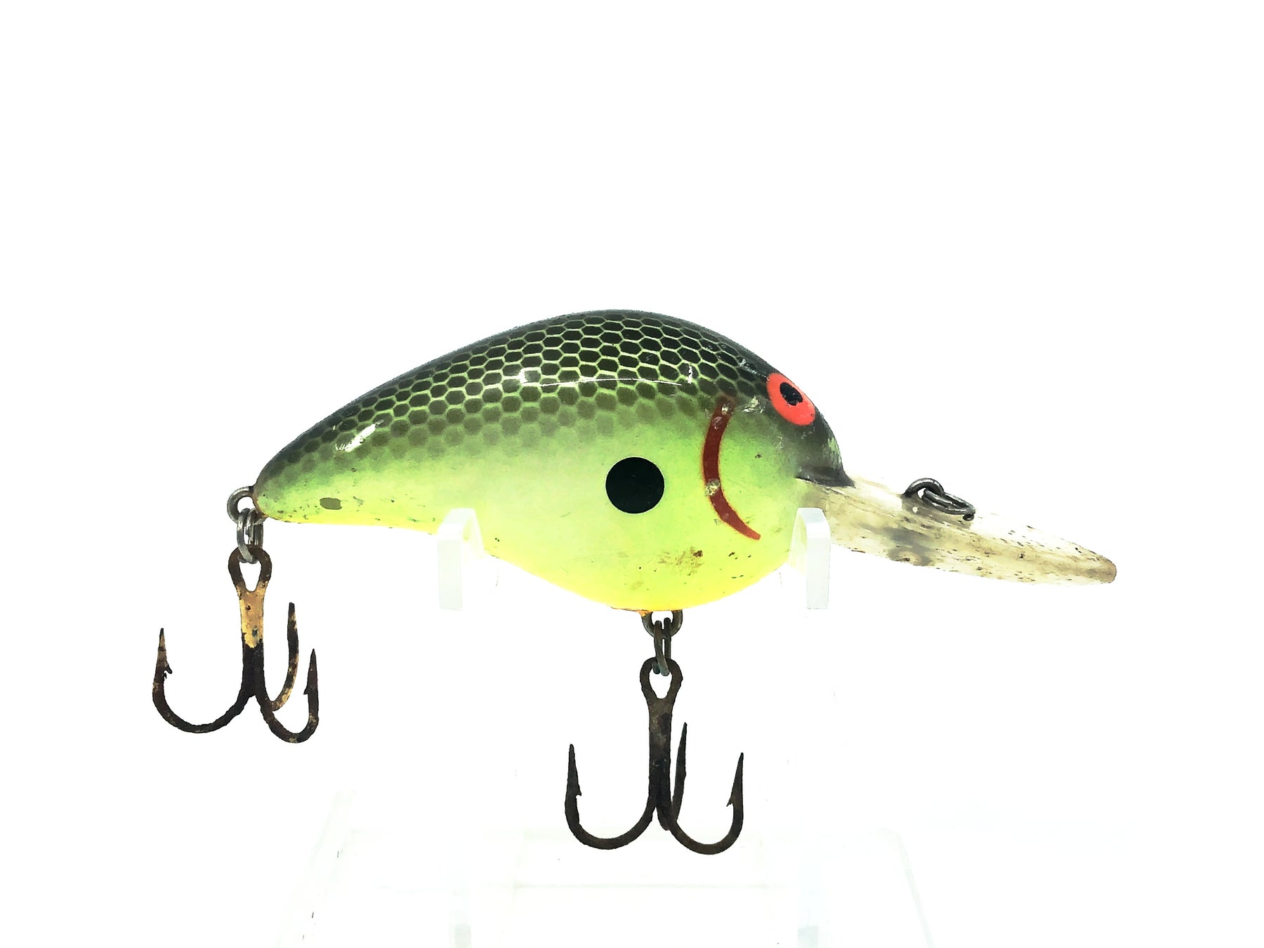 Bomber Fat A 6F, FYBS Chartreuse/Black Color. About 2 1/4" long body not including lip. This lure has some wear, marks and rust on the hooks but in overall ok condition. See photos. Fish or collect.