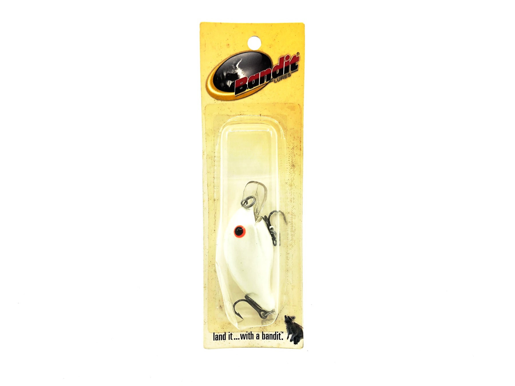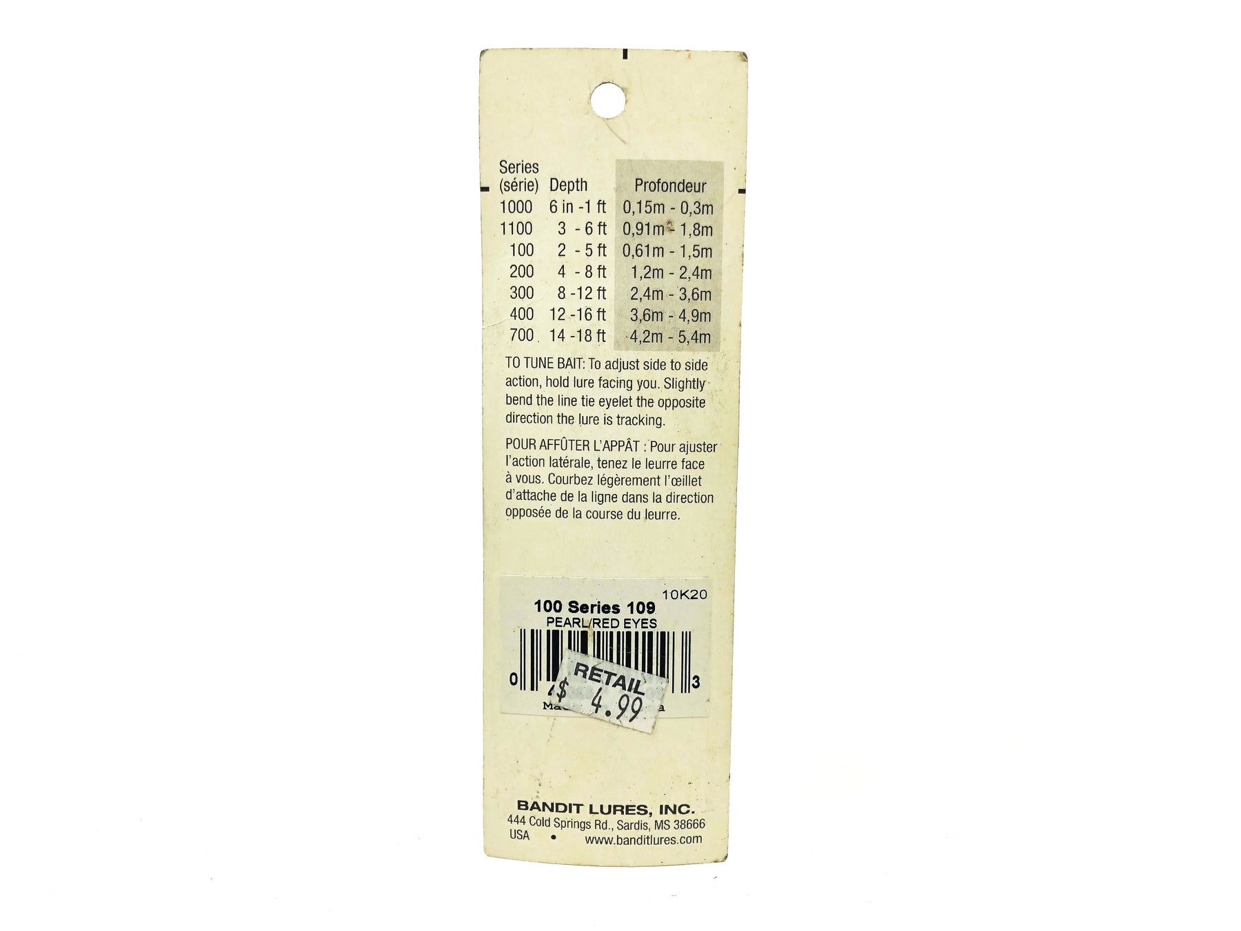 Bandit Series 100, Pearl/Red Eyes 109 Color. Old stock Bandit here. Lure is new on card. Card is in good condition with some minor marks. Grab these while you can! Great deal on a bait that's so sought after. Classic Bandit lure!