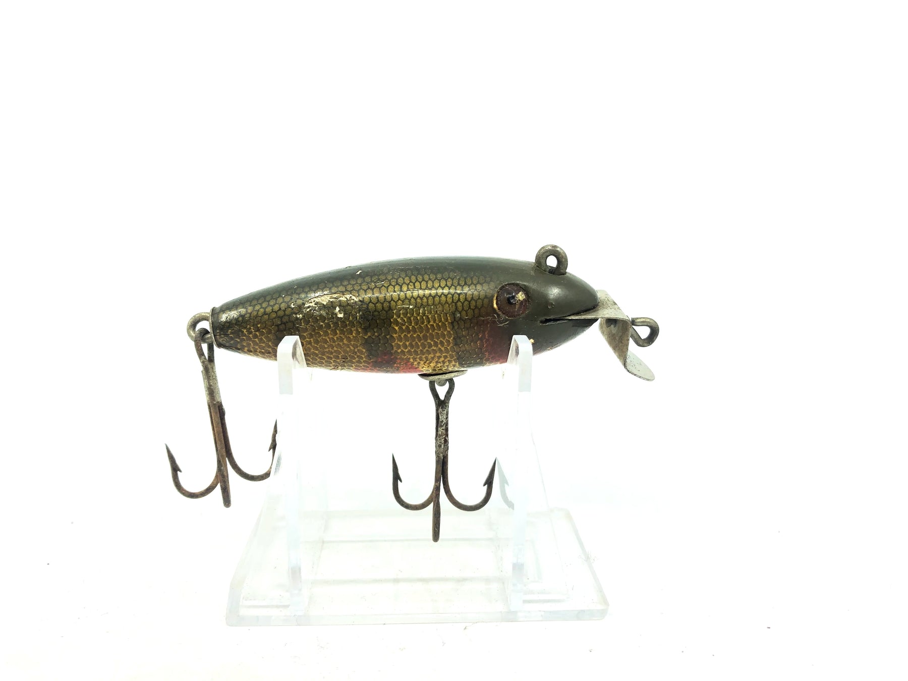 Creek Chub 200 Baby Wiggler in Perch Color 201 Wooden Lure Glass Eyes. About 2 3/4" long. Vintage wooden lure with glass eyes and a double line tie dating this one pretty early in the Creek Chub history. The Creek Chub Baby Wiggler was made from 1917 - 1954 and was one of the more famous Creek Chub lures. This one is vintage and shows some wear but in overall ok condition, see photos. Collect or fish this great vintage lure.