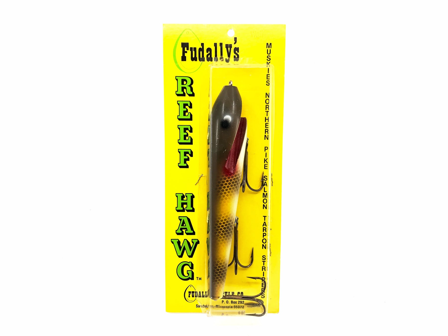 Fudally's Reef Hawg, Walleye Color on Card. Quality wooden musky bait! Lure is about 7 3/4" long. This lure is new on card and the card is in good condition. See photos.