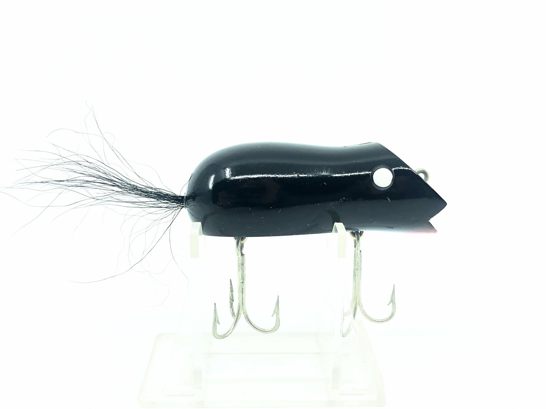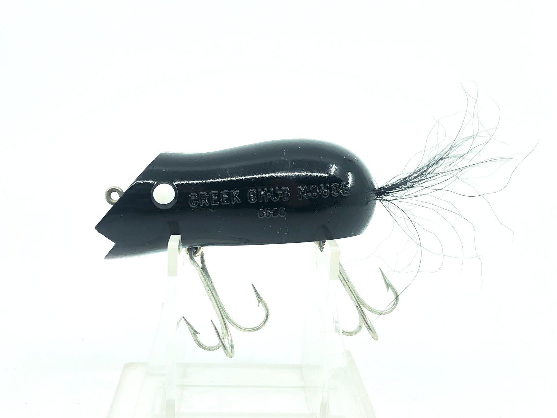 Creek Chub 6580 Mouse, Black Mouse Color.  About 2 3/4" long body.  Used vintage lure with some wear and waxing as shown but still in overall good condition.  See photos.  Made from 1957-1978 by the Creek Chub Bait Company.