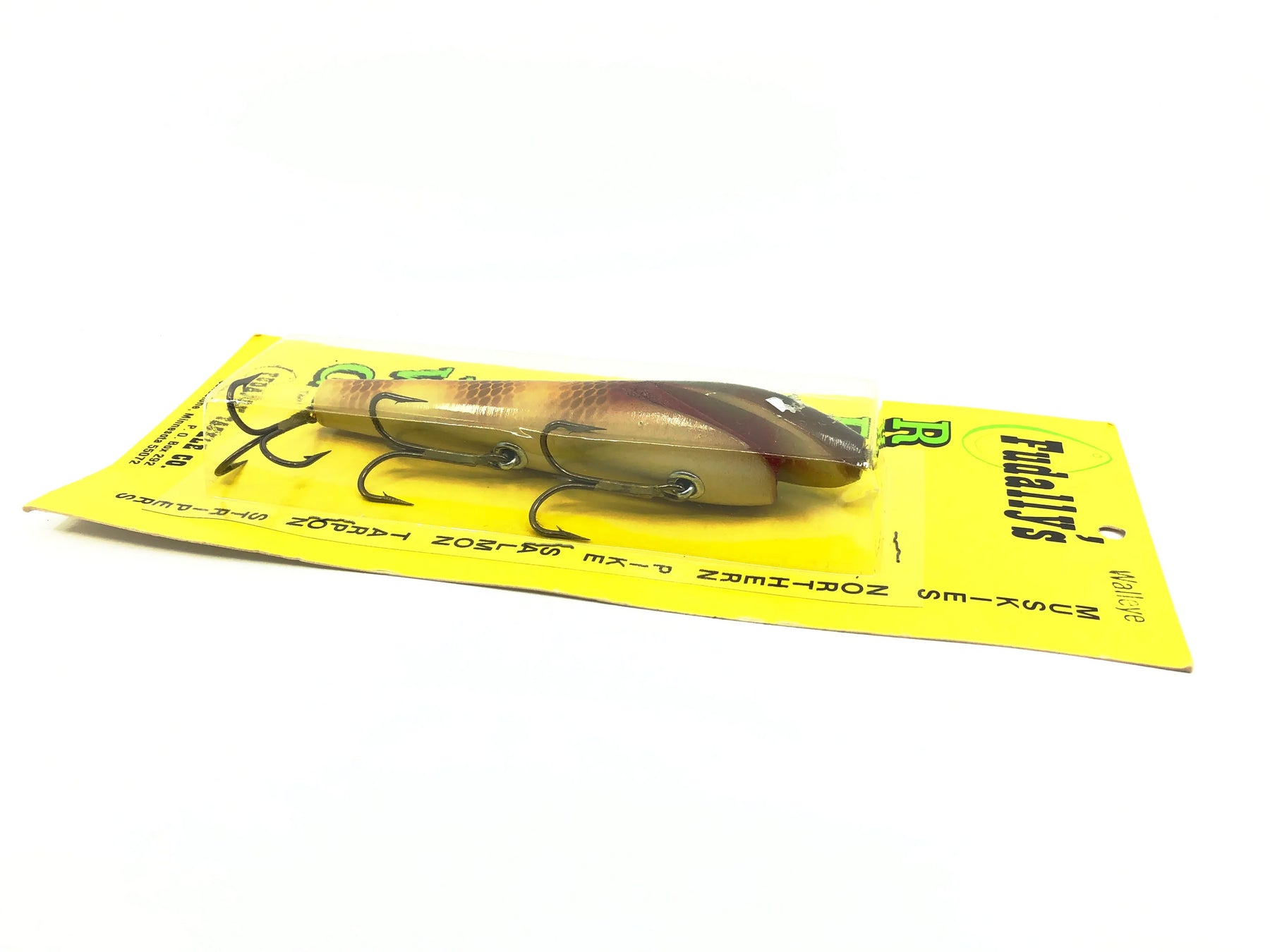 Fudally's Reef Hawg, Walleye Color on Card. Quality wooden musky bait! Lure is about 6" long. This lure is new on card and the card is in good condition. See photos.