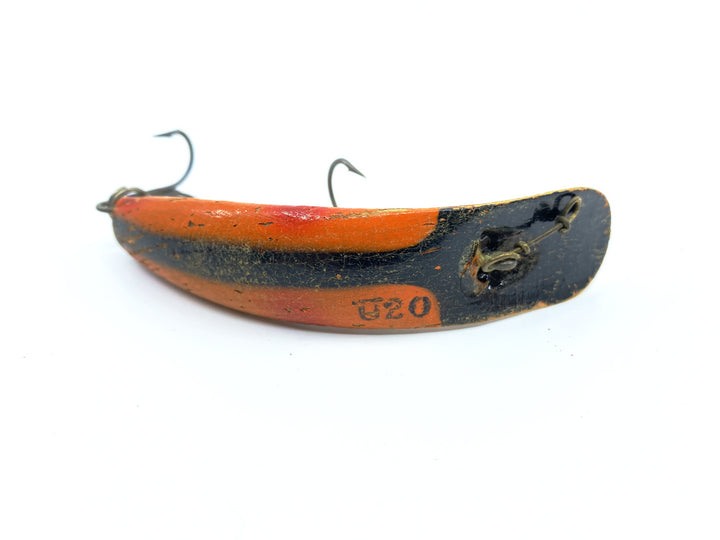 Wooden Helin Flatfish U20 OB Orange Red Tip Black Stripe Color. About 3 1/4" long. Used vintage lure with some marks and wear but in overall ok condition. Classic lure here. See photos. Fish or collect!