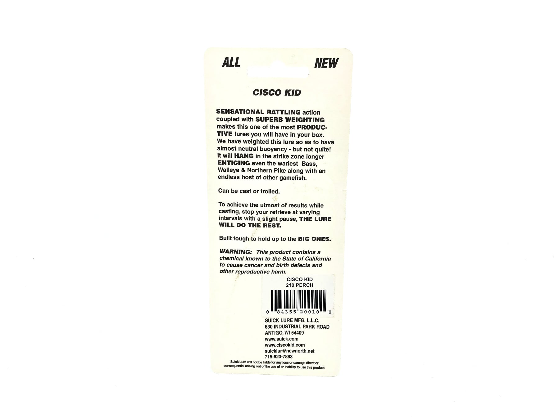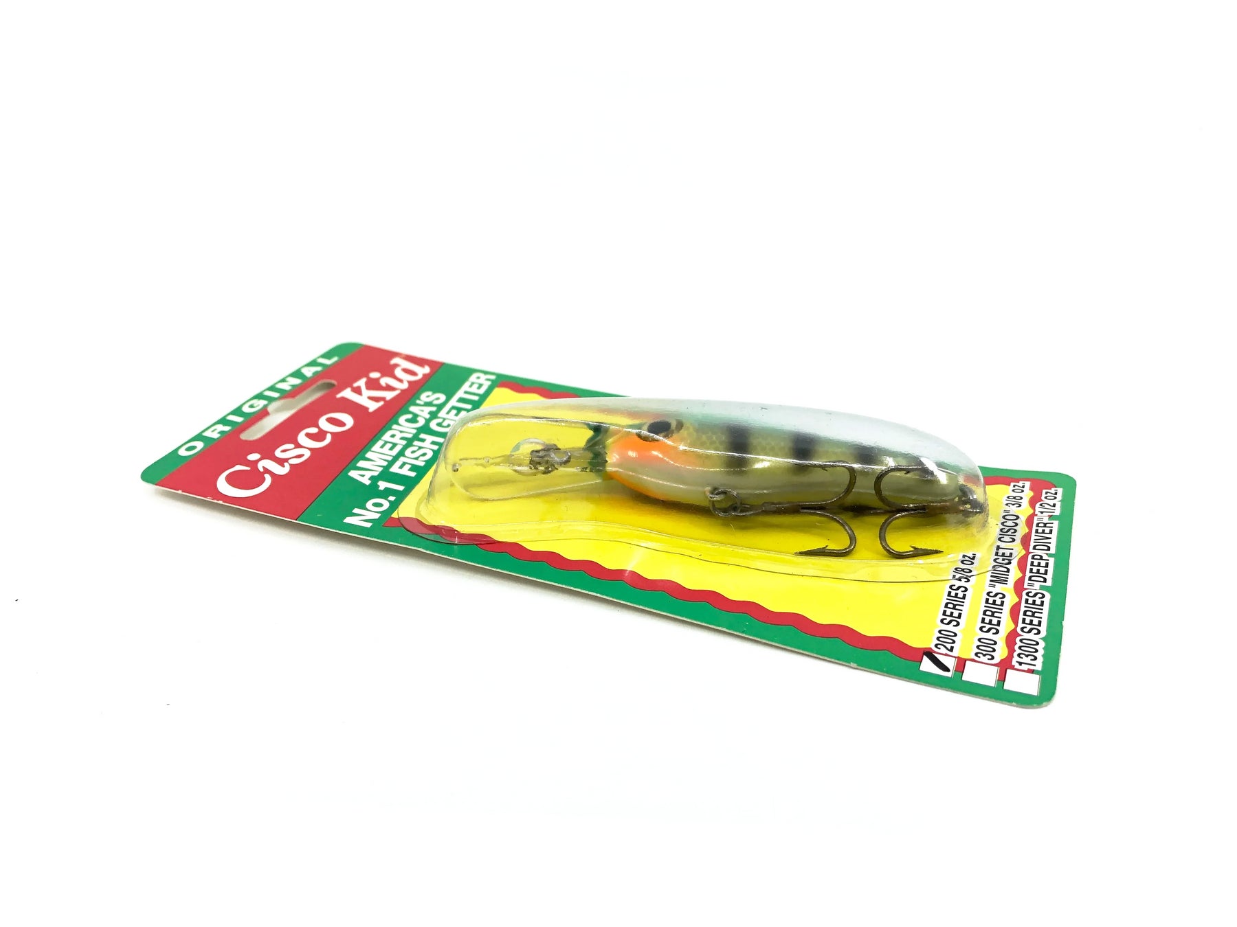 Cisco Kid Baby 200 Series, #10 Perch Color on Card. About 4" long including lip. Great vintage Cisco Kid lure here. Great for fishing, walleye, bass, pike! Great for collecting. This is a newer vintage Cisco Kid but still hard to find! Lure is new on card and the card is in good condition. See photos. Fish or collect!