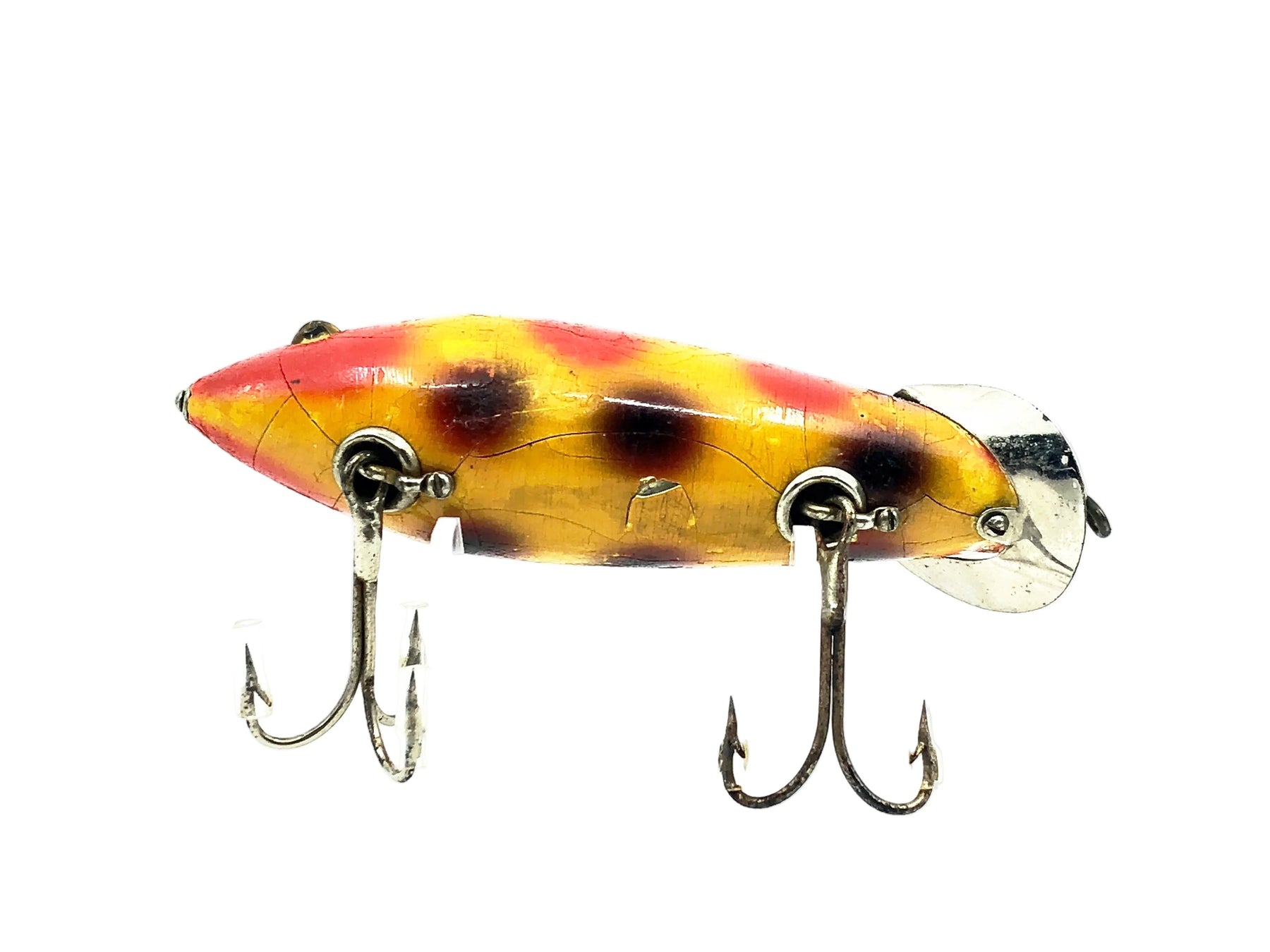 Heddon 1800 Crab Wiggler, S Strawberry Color. More yellow variation of a classic color on the Heddon Crabs.  Lure is about 4" long body. Wooden lure, glass eyes.  Used with some wear and marks as shown but still in overall ok condition.  Nice color.  Add to your collection, see photos.