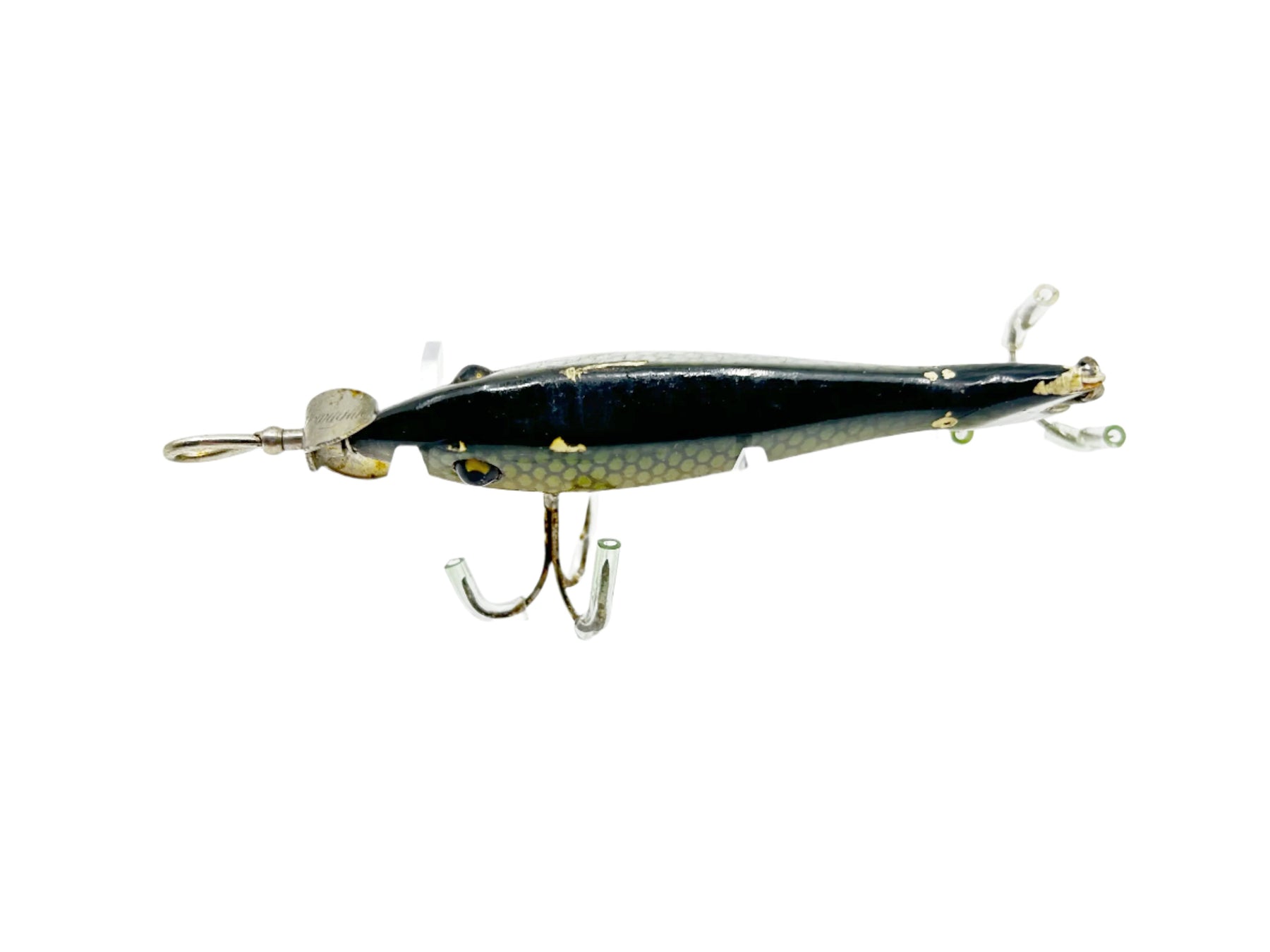 Heddon Saltwater Florida Special 19BD in Green Scale Color. Lure is about 3 1/2" long body. Wooden lure, glass eyes. Used with some wear as shown and front prop is hard to turn but overall in good condition. Dating from 1920-1922. Tougher to find, especially in the larger size. Add to your collection, see photos. Marked front props.