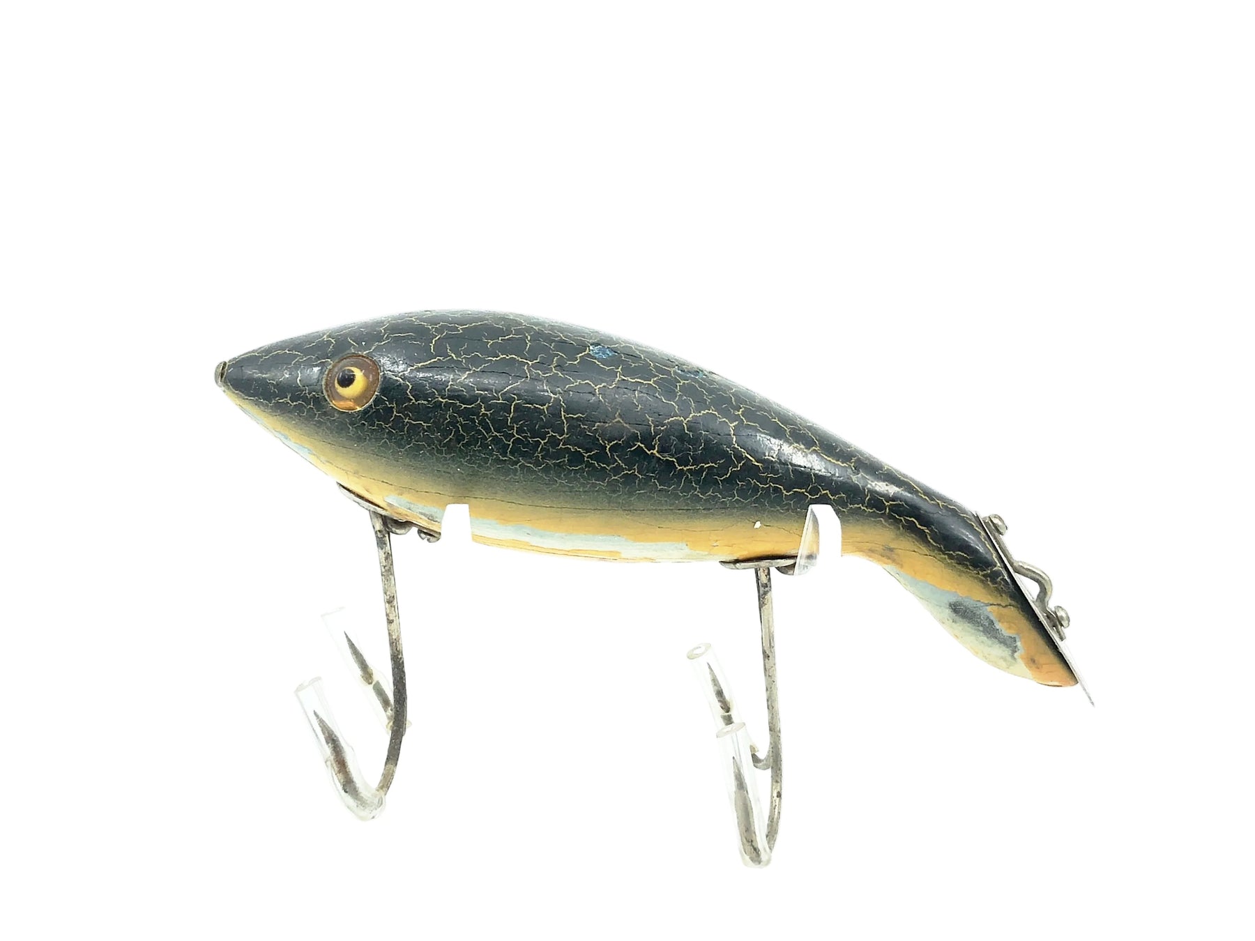 Heddon Wooden 5000 Tadpolly, GCB Green Crackle Back Color, L-Rig. Classic color on this lure. Lure's wooden body is about 3 7/8" long. L-rig hardware, marked lip. This Tadpolly has some wear on the belly but the sides and top are in great condition. Hard to tell this is a 100 year old bait! Add to your collection, see photos.