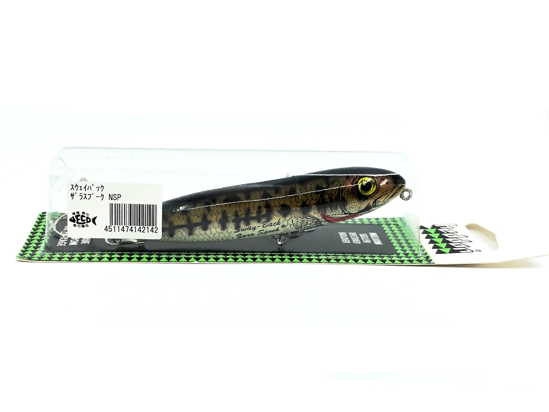 Heddon Sway Back Zara Spook, NSP Natural Spotted Bass Color on Card. Older Zara spook here. Lure is about 4 1/4" long. This model is originally from Japan. This lure is new on card. Card is in good condition with some minor wear, but in overall good condition. Great combo here, fish or collect.