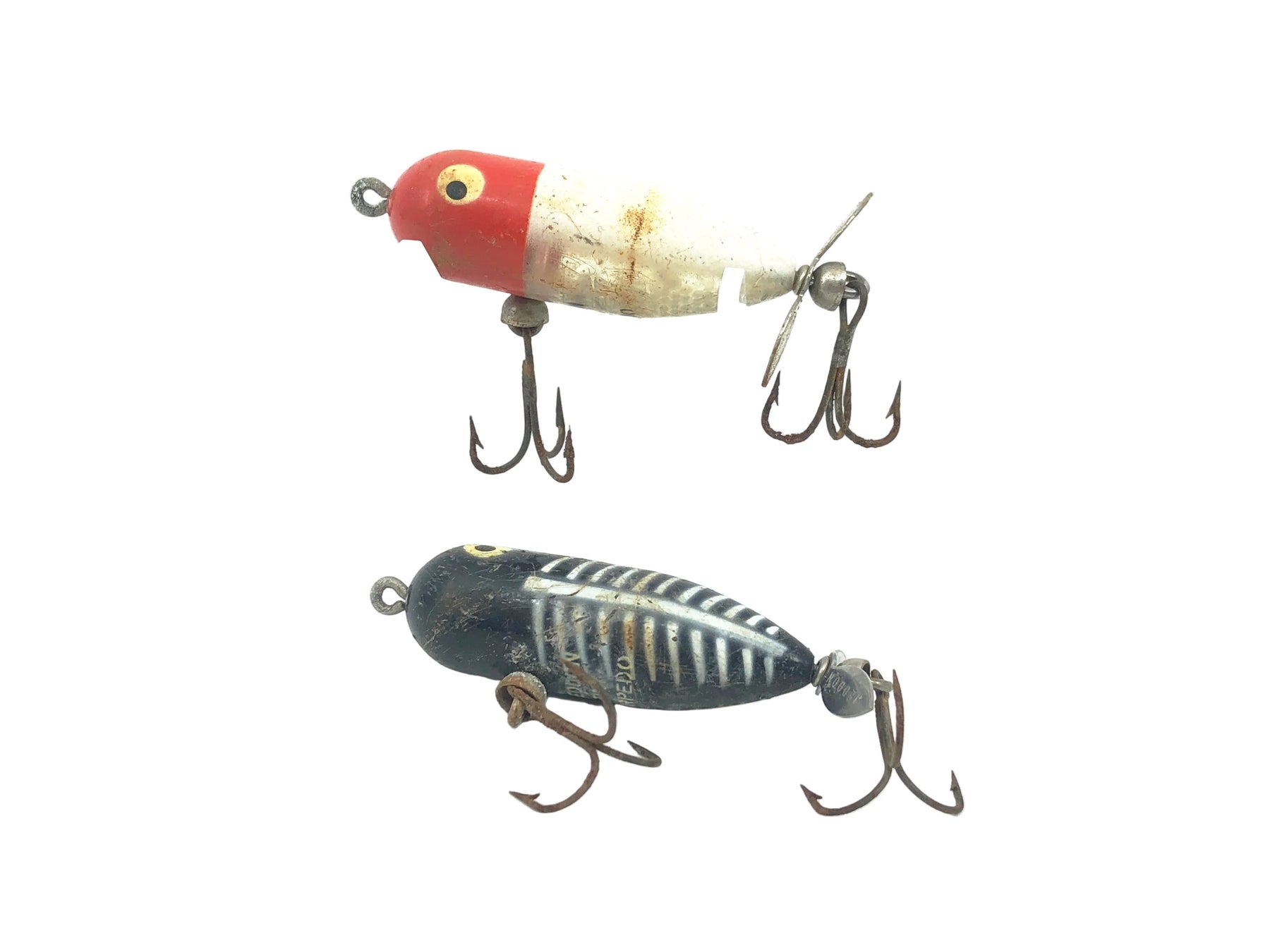 Heddon Tiny Torpedo Combo Pack. This pack includes two Heddon Tiny Torpedos: 1, in Black Shore, 1, in Red Head/White. Lures are about 2" long. Both are used with wear, marks and some rust on the hooks, overall in fair condition. Iconic top water bait to fish or collect. See photos. Add some new hooks and clean up a little and take these classics back out fishing.
