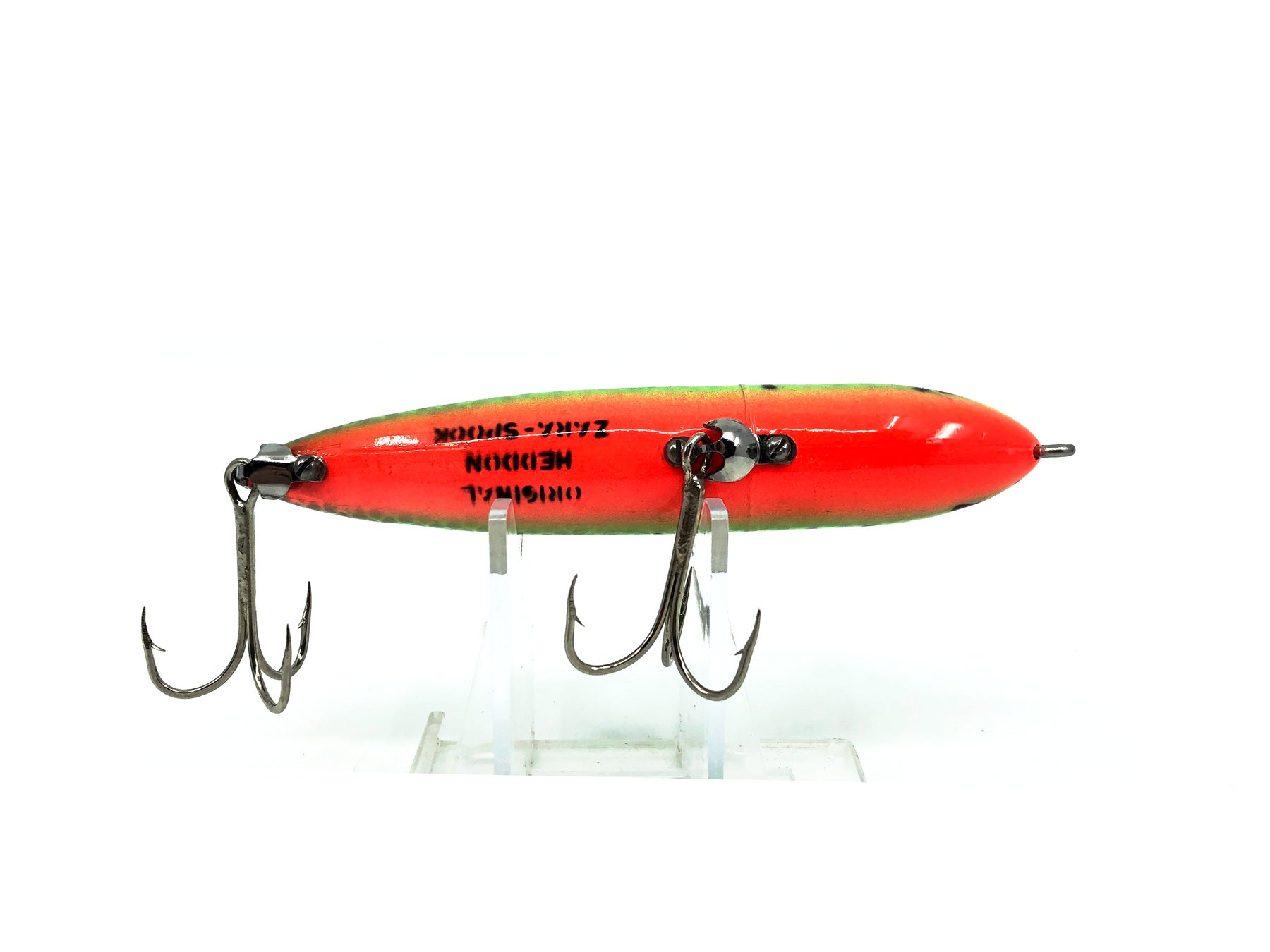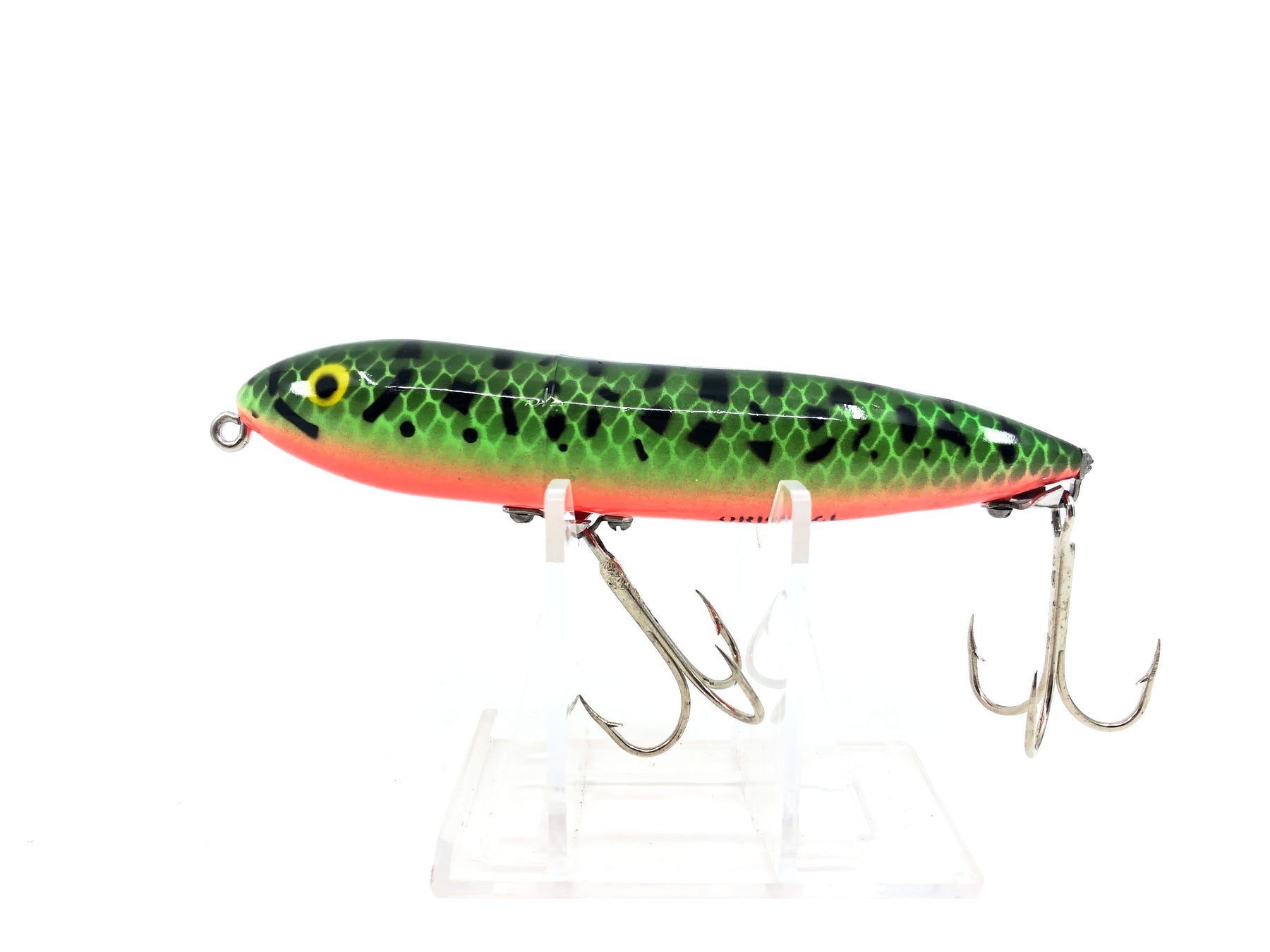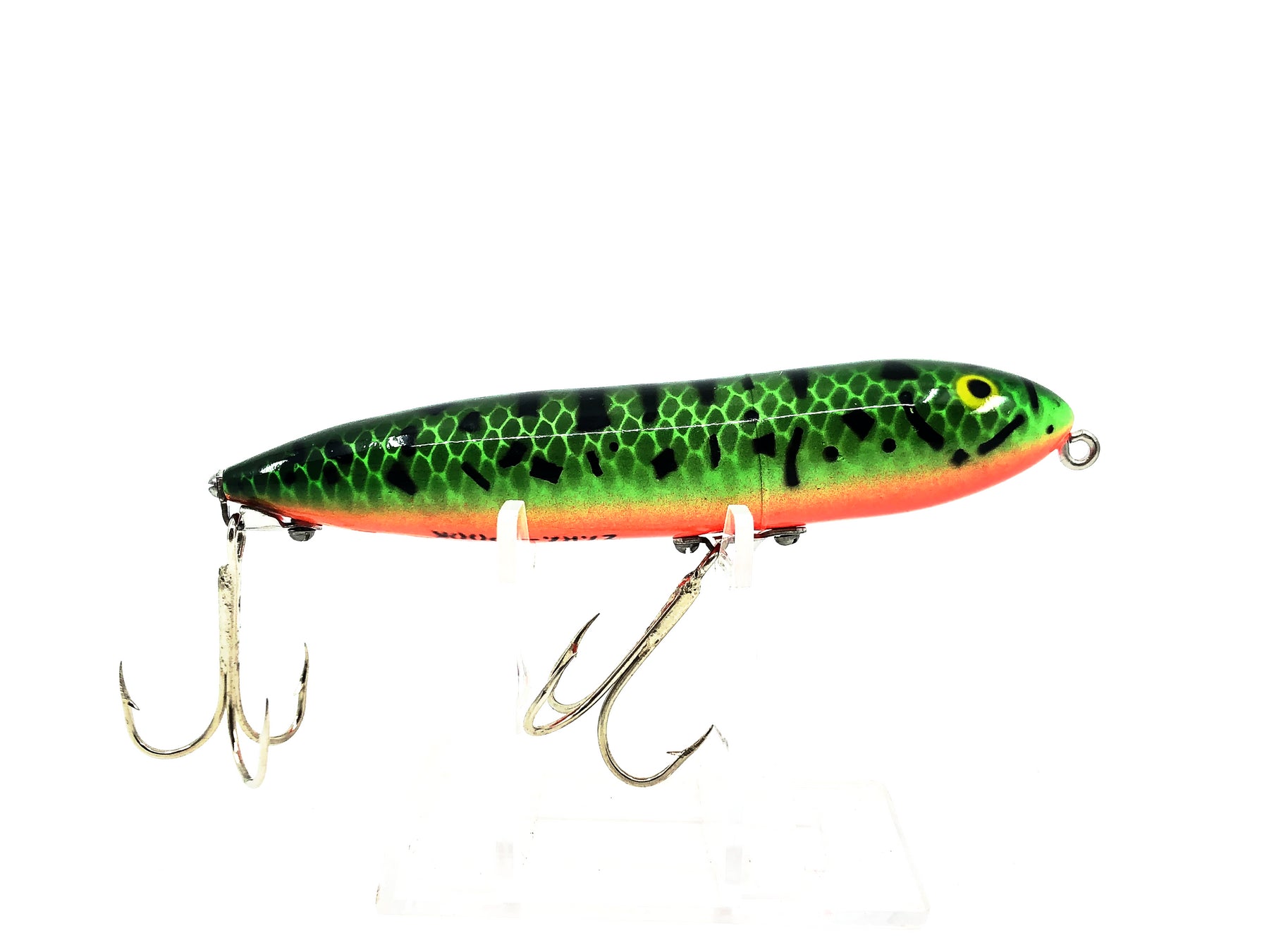 Heddon Swayback Zara Spook, GR Green Crawdad Color. Lure is about 4 1/4" long. This lure is used with some minor wear and marks but in overall good condition. Great for fishing or add to your collection. See photos.